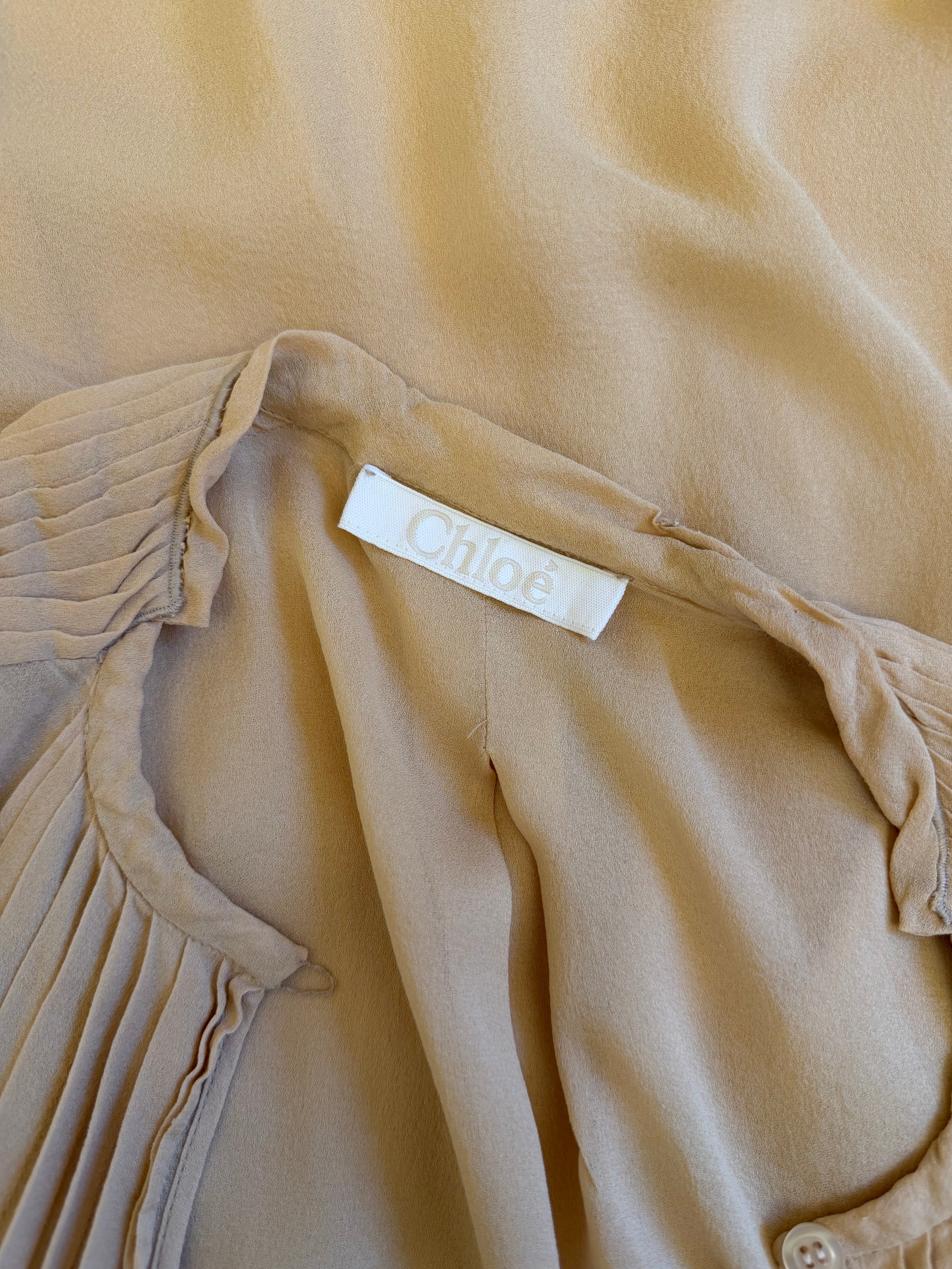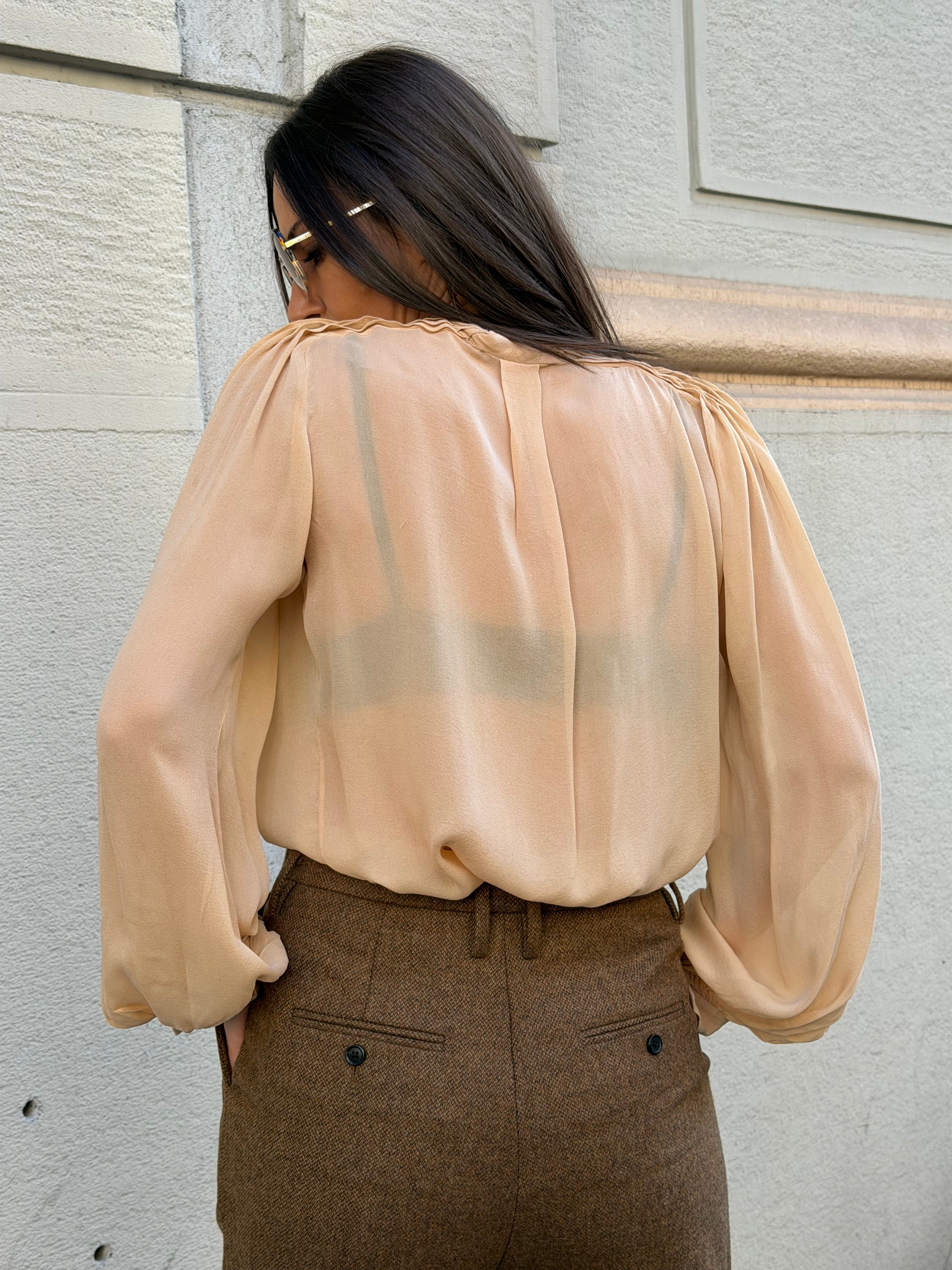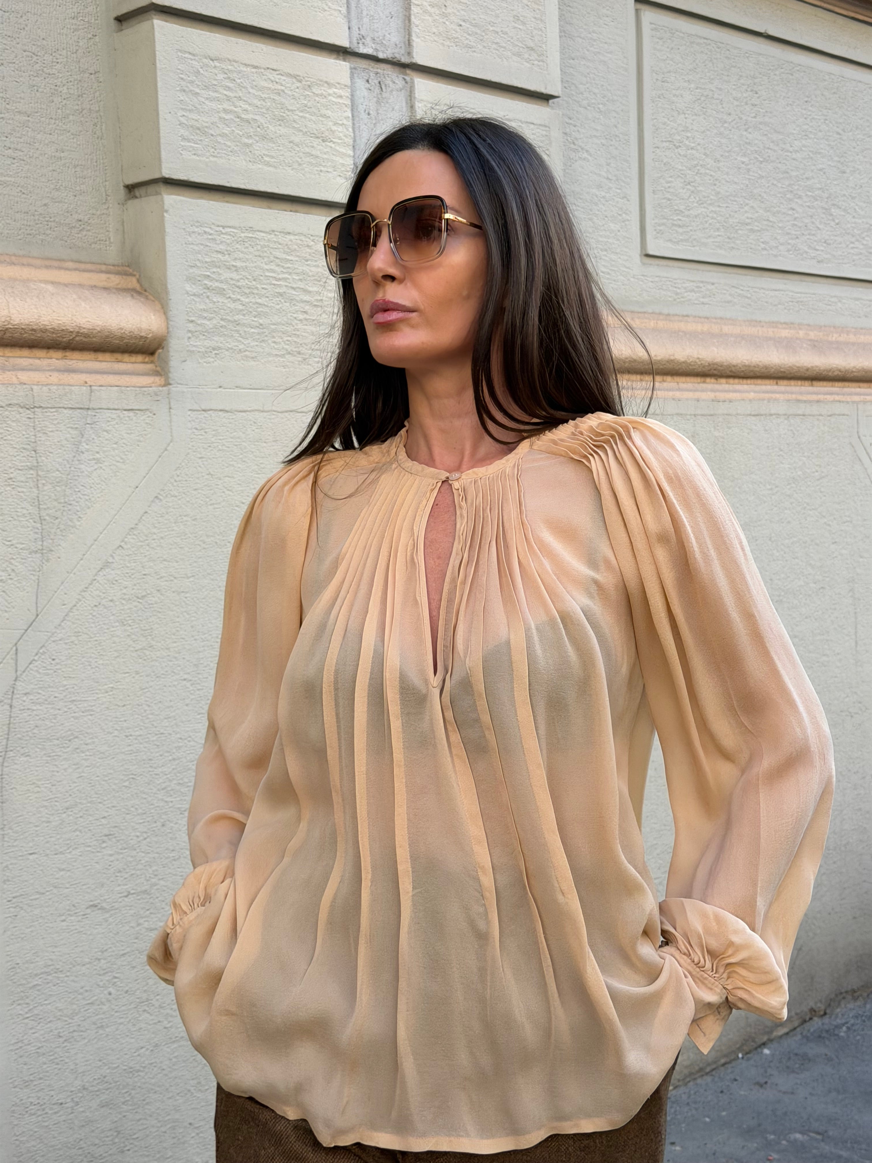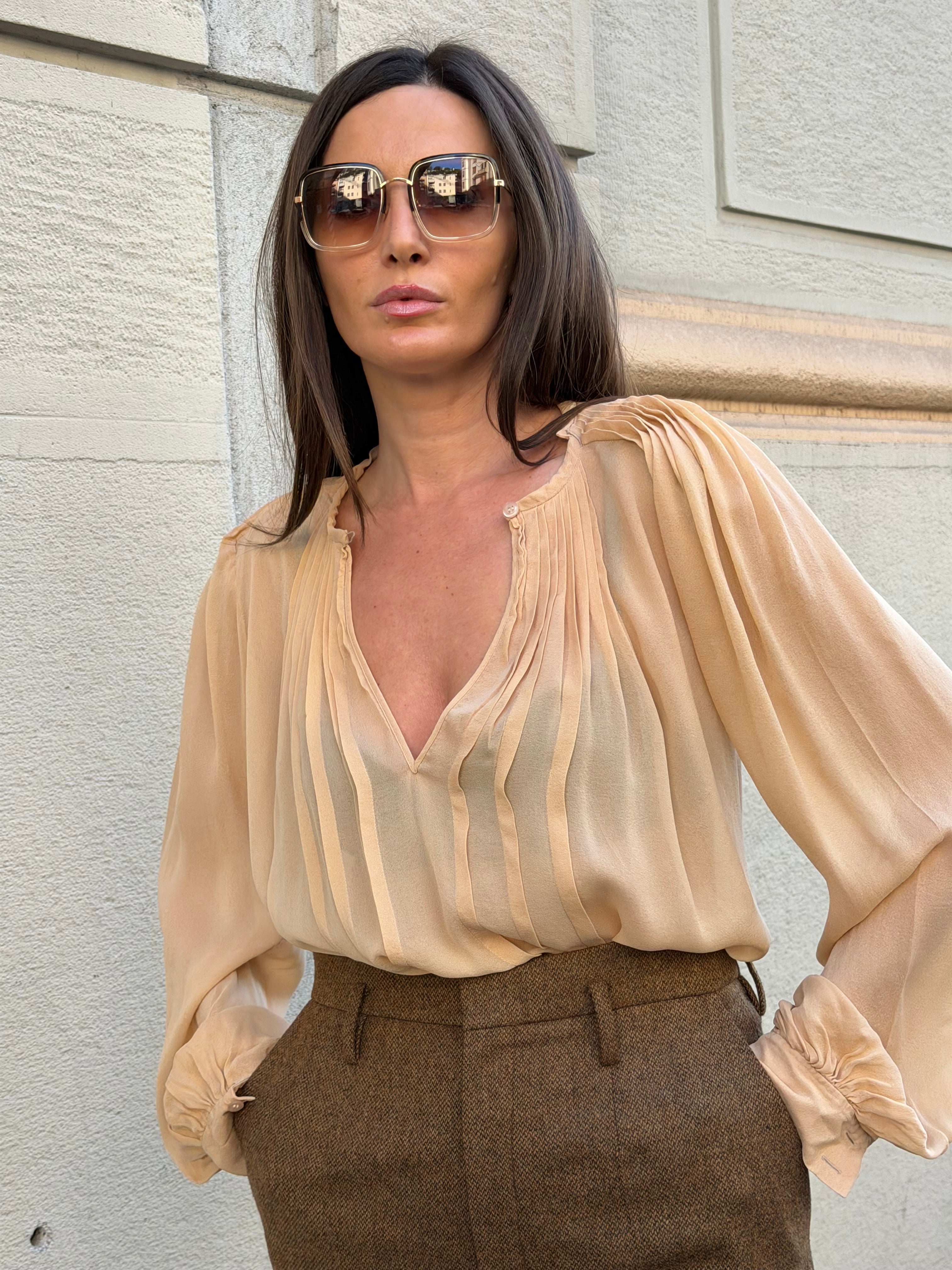 Maxi blusa vintage Chloè in 100% seta. Color crema. Etichetta taglia e composizione assente, ma veste taglia S/M - lunghezza 66 cm.