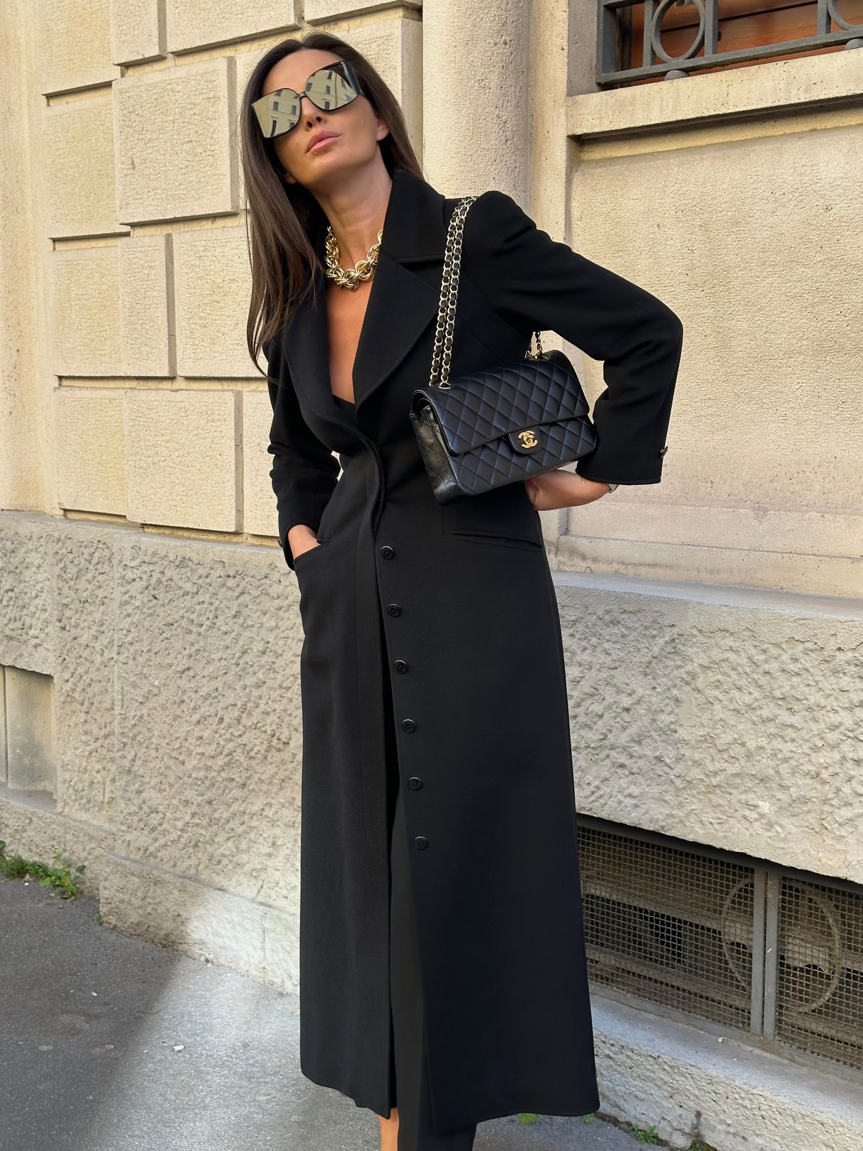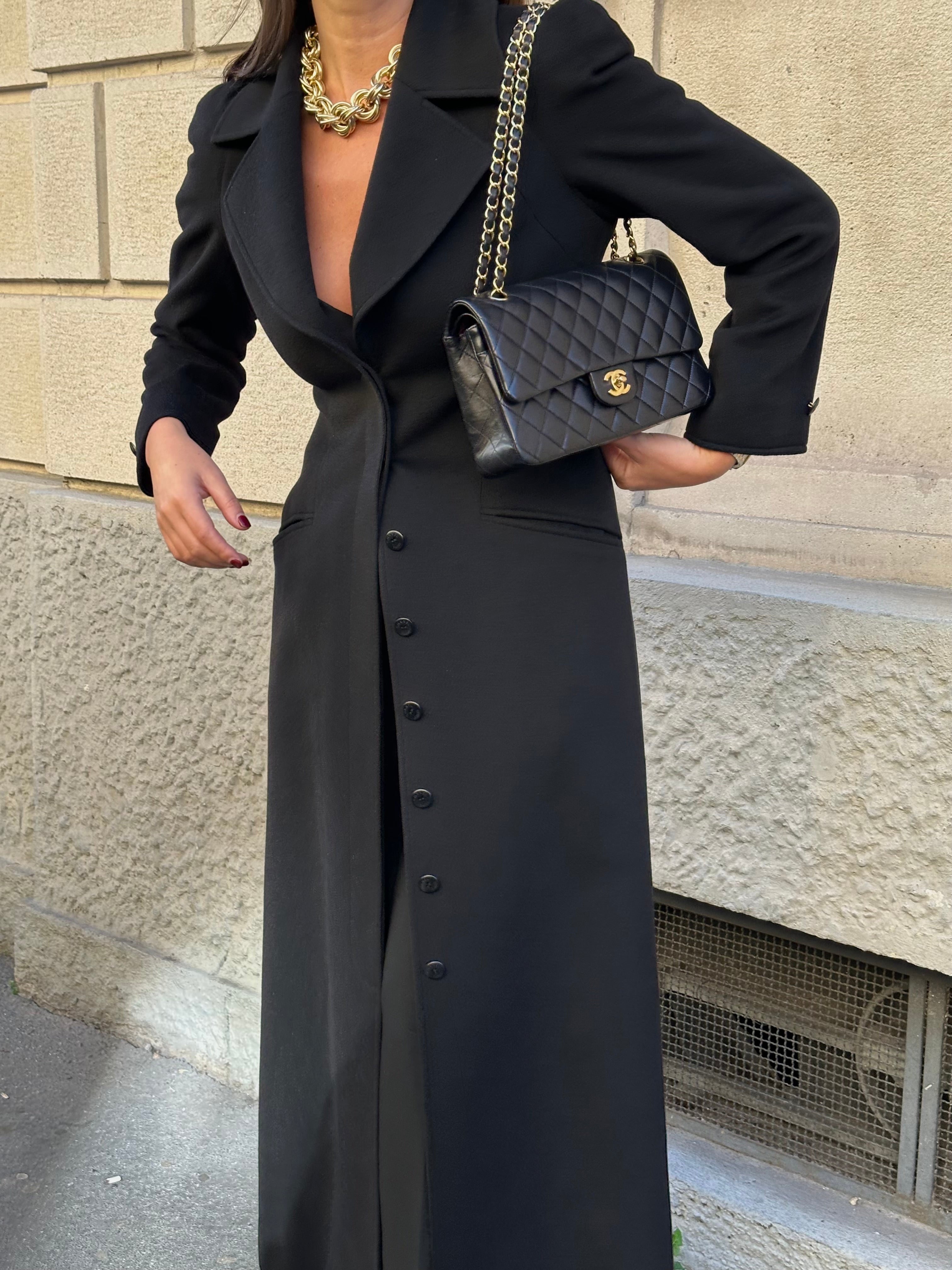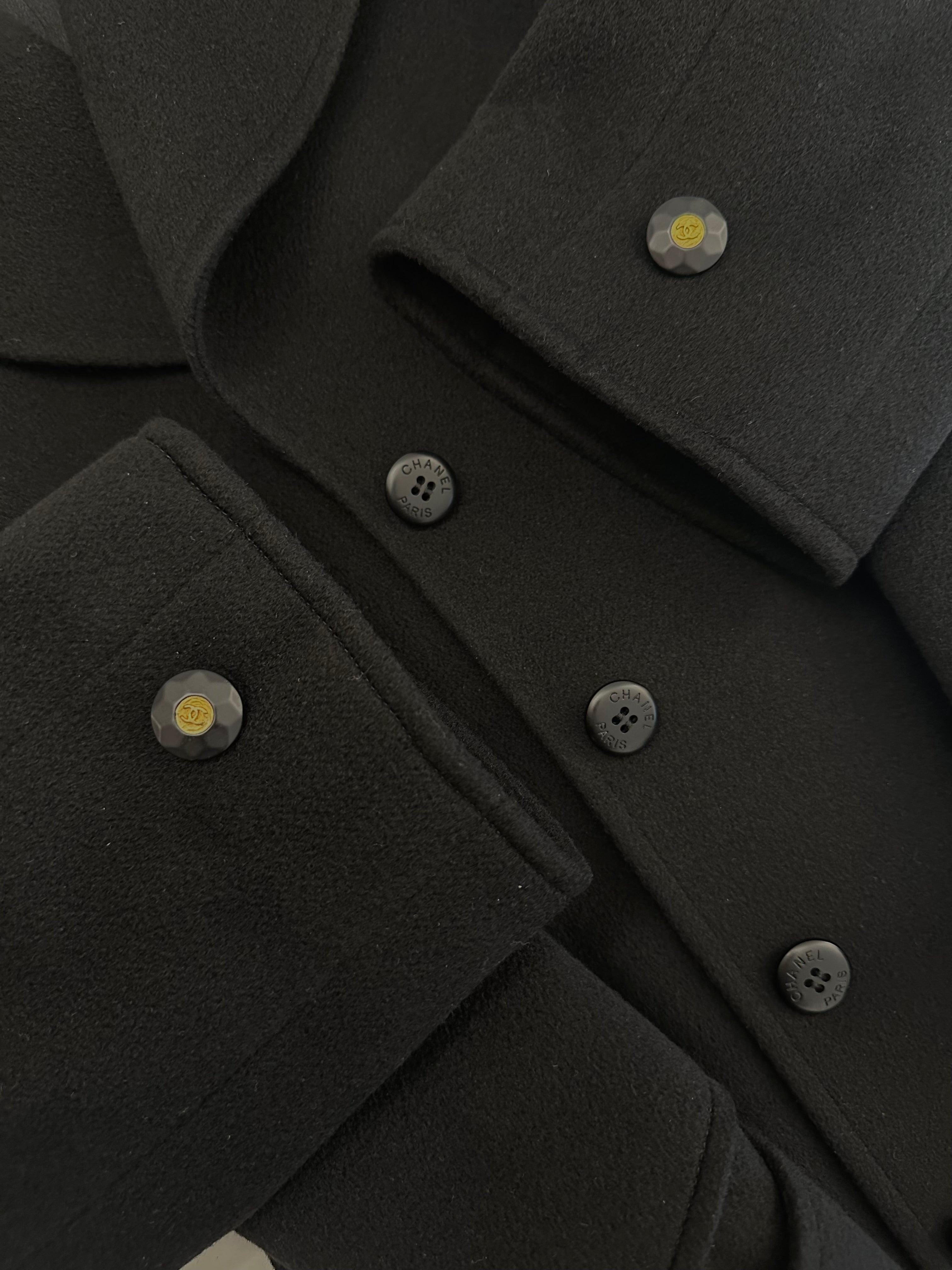 Bottoni in tinta marchiati Chanel Paris + 2 bottoni gioiello sulle maniche con CC logo dorato.