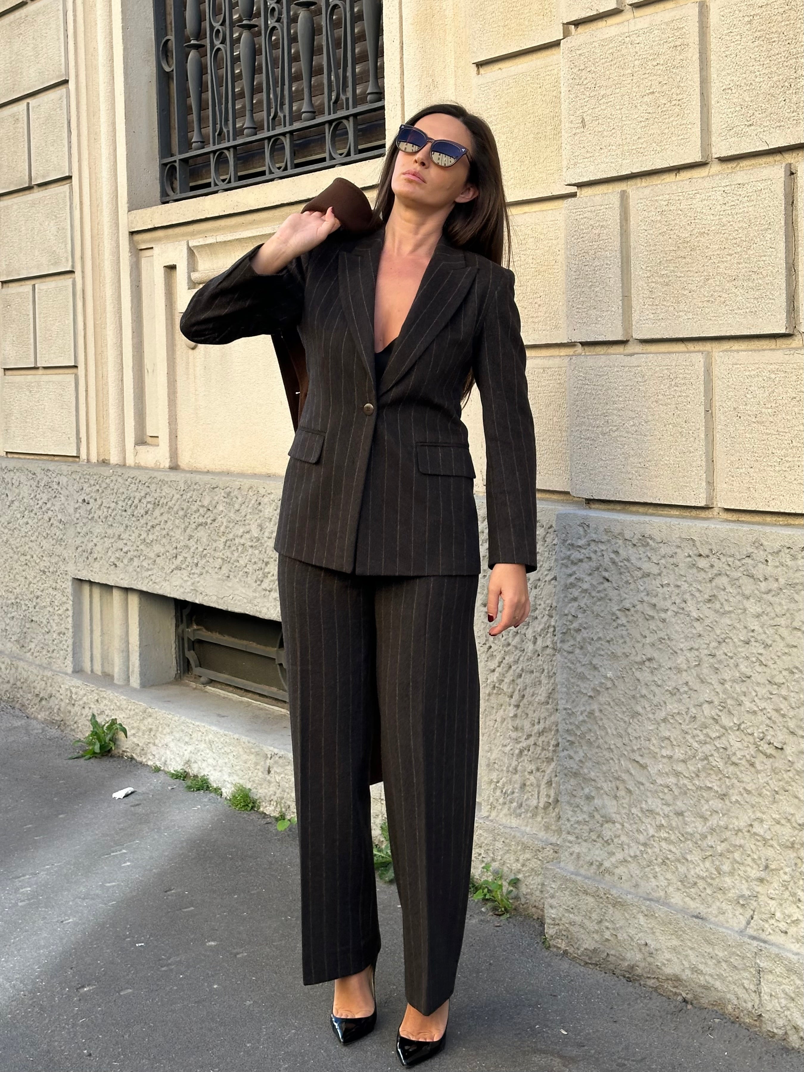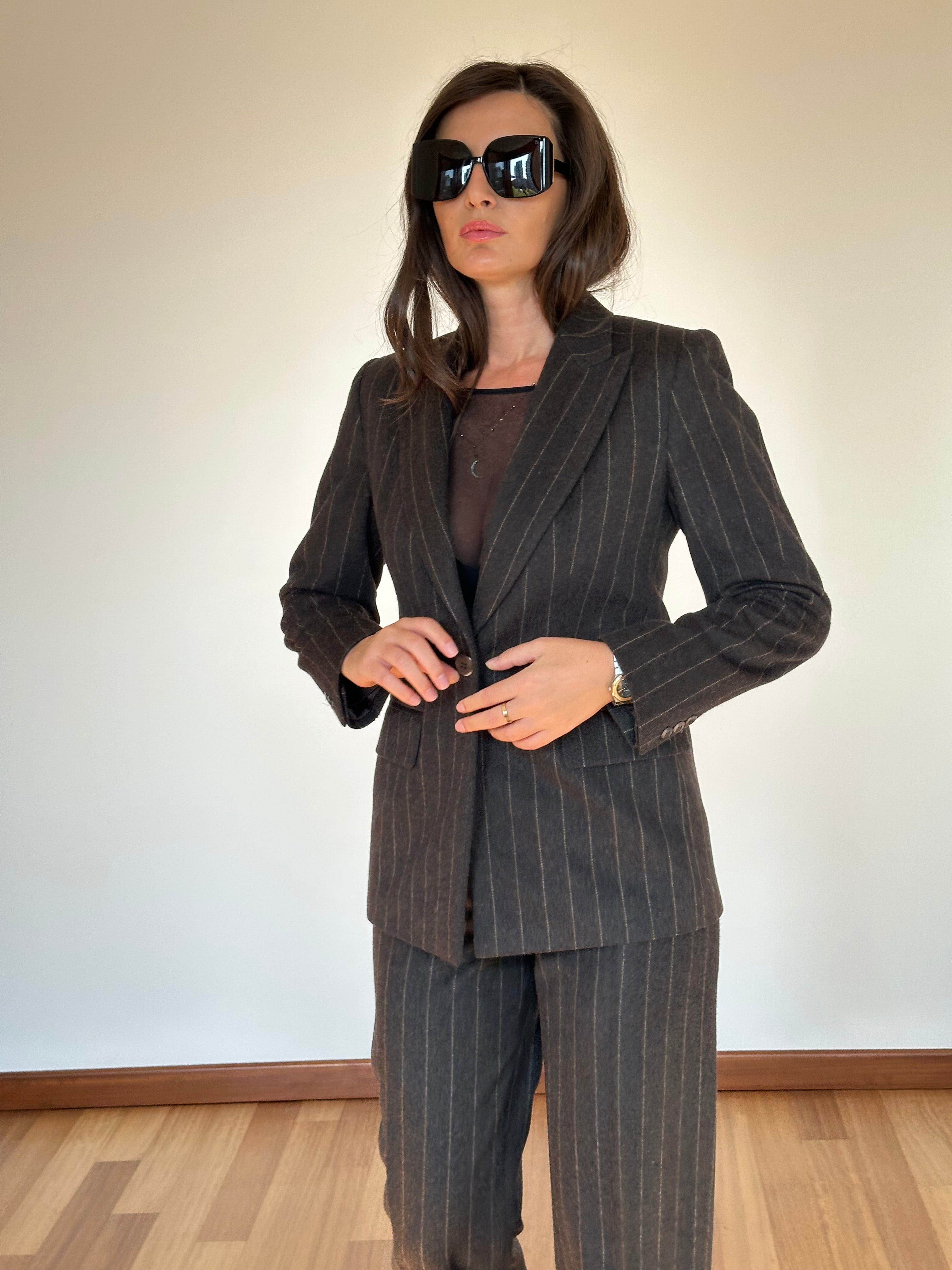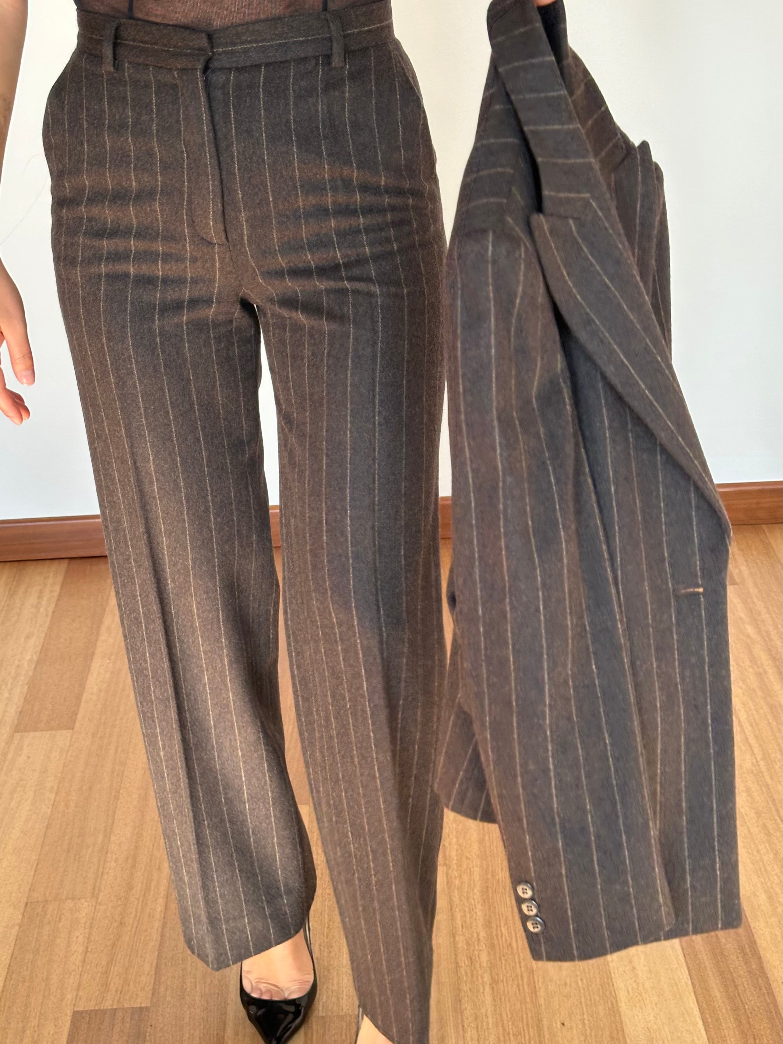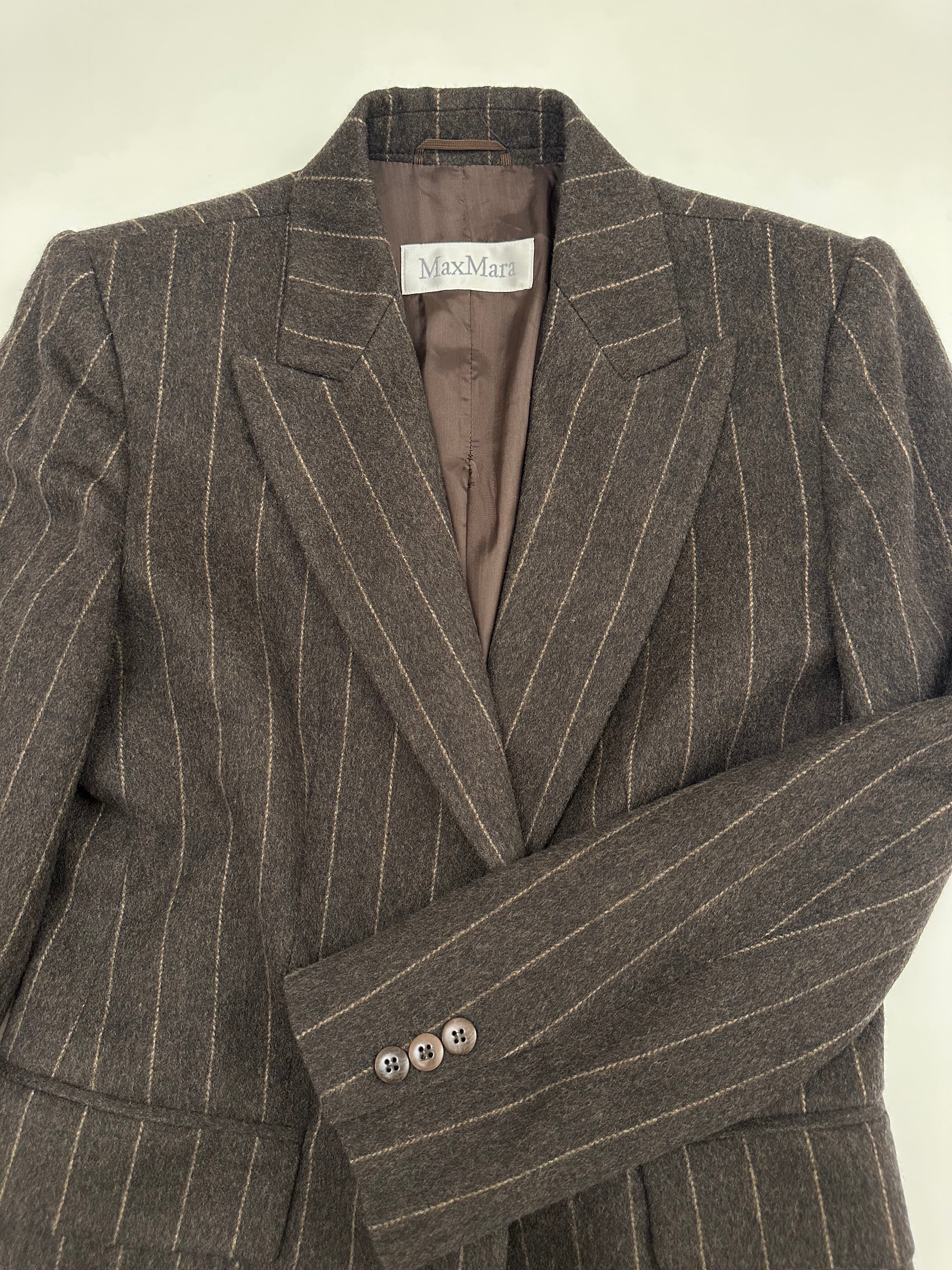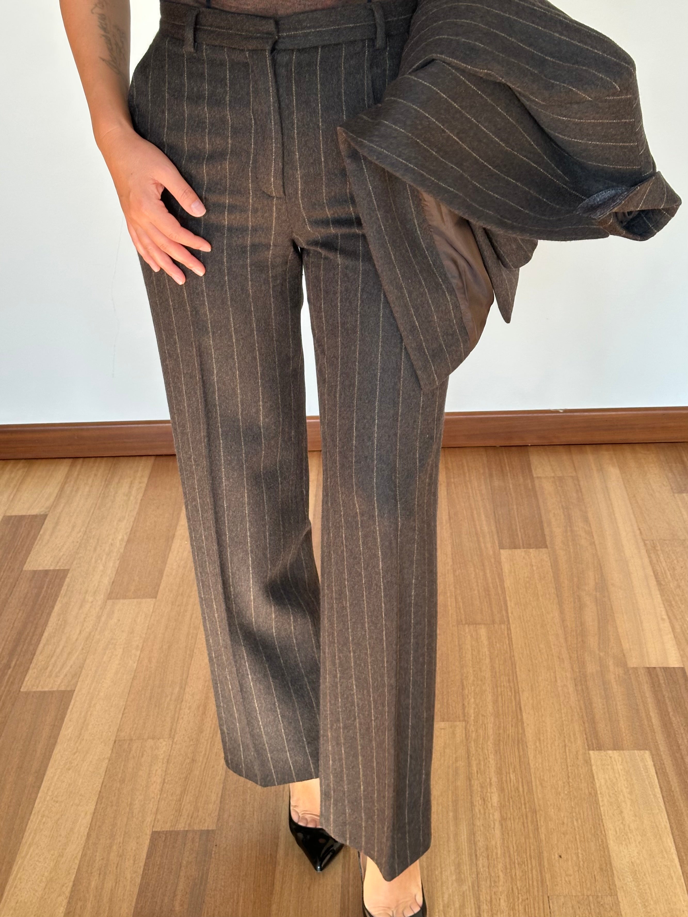 Tailleur Max Mara in 80% lana e 20% angora. Marrone gessato beige. Pantalone e vita alta.