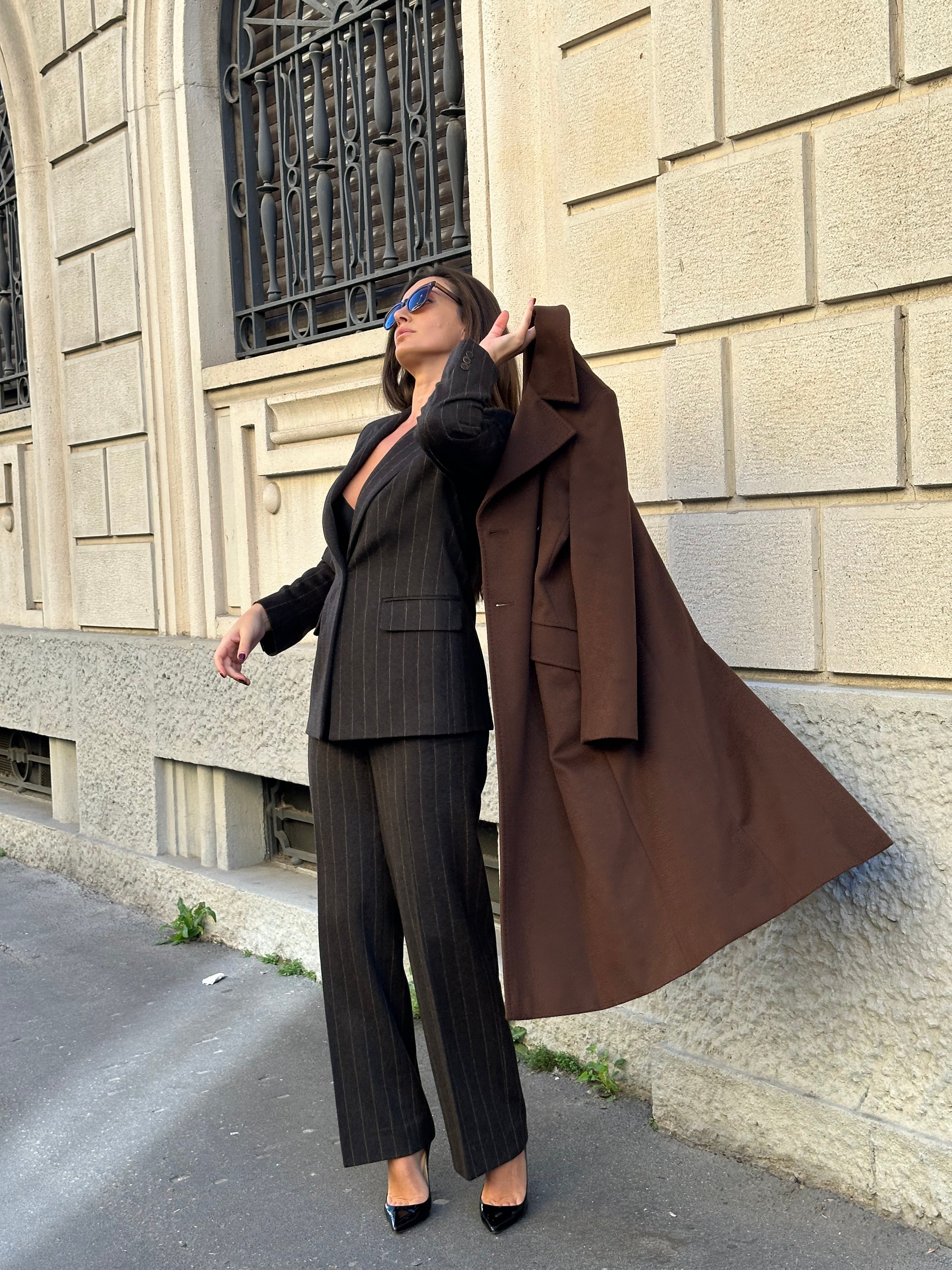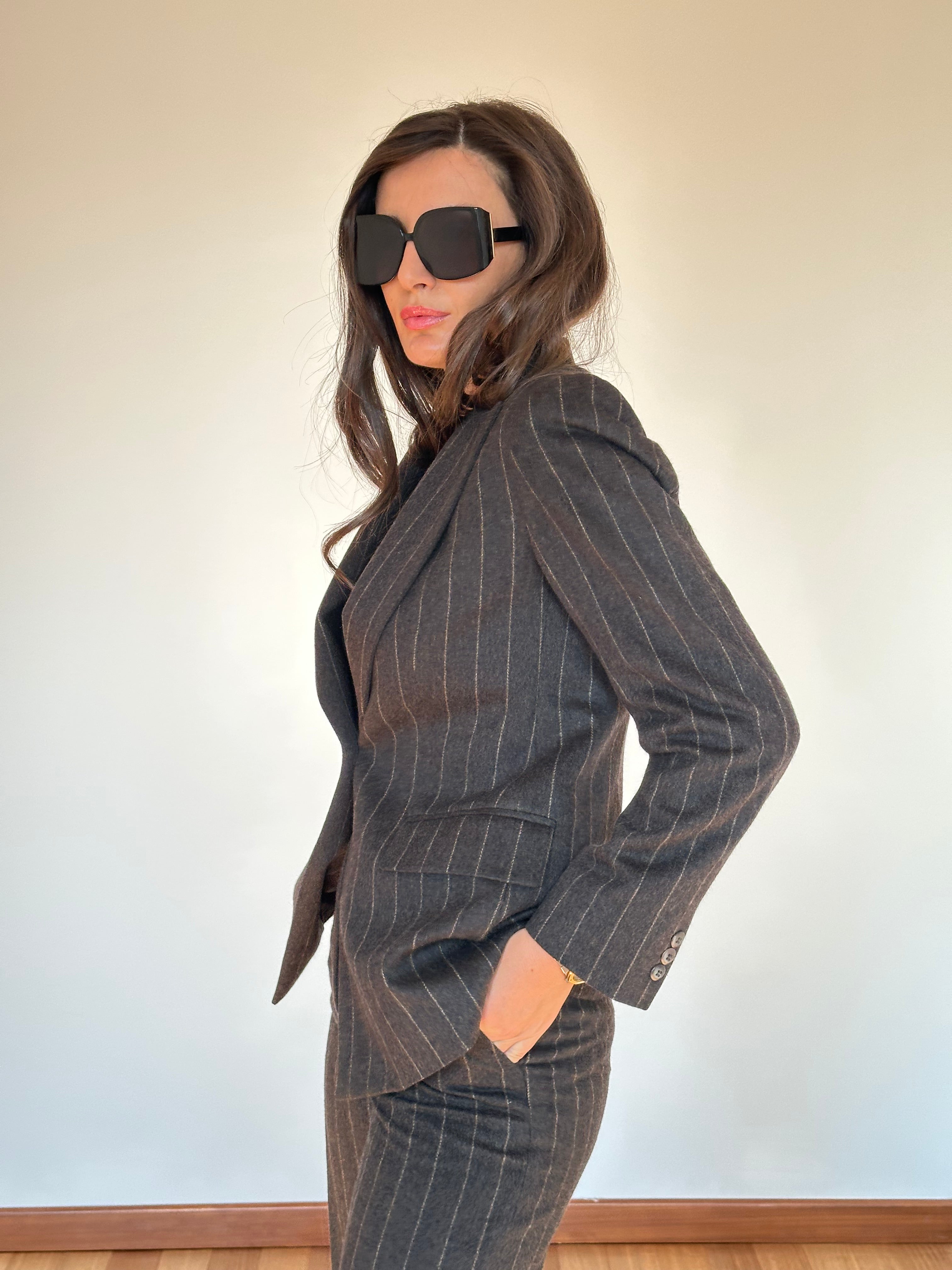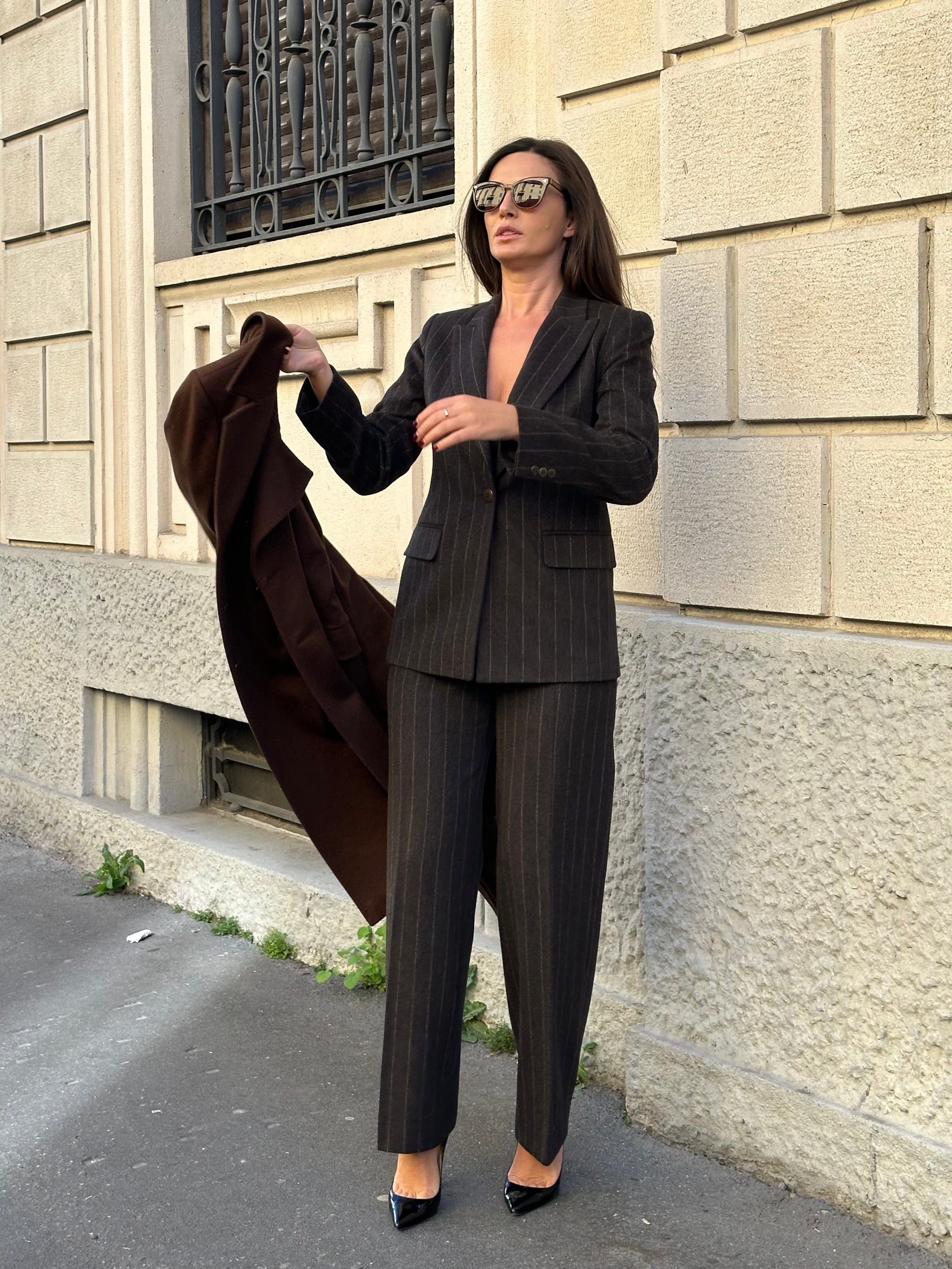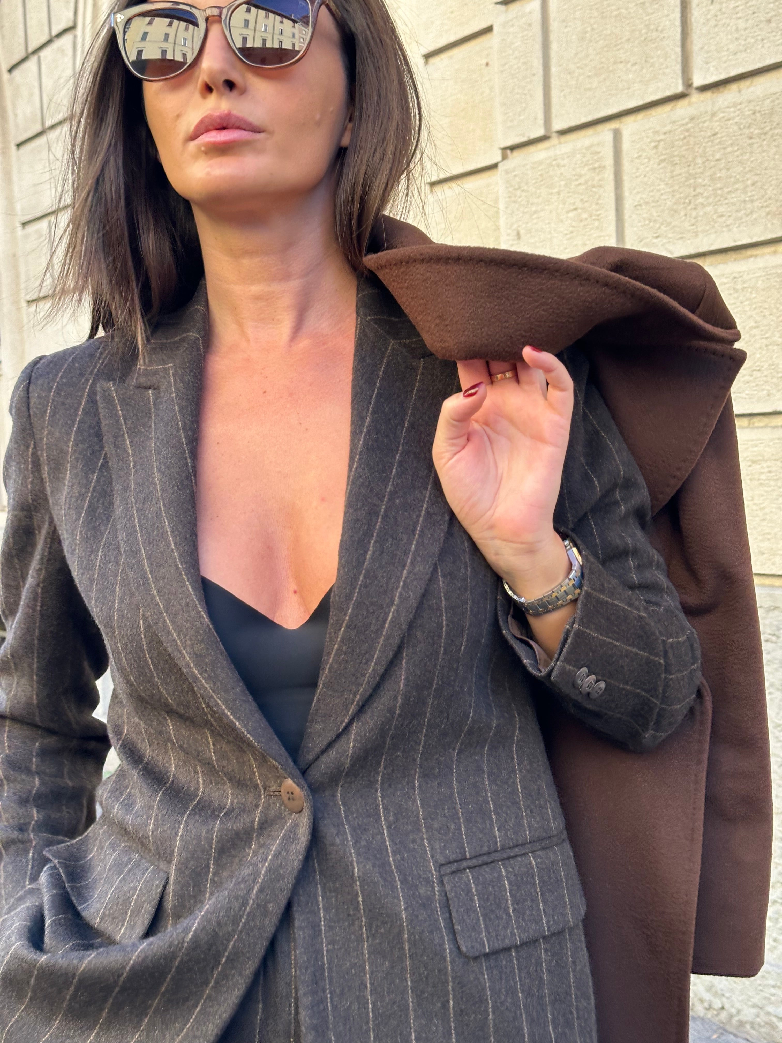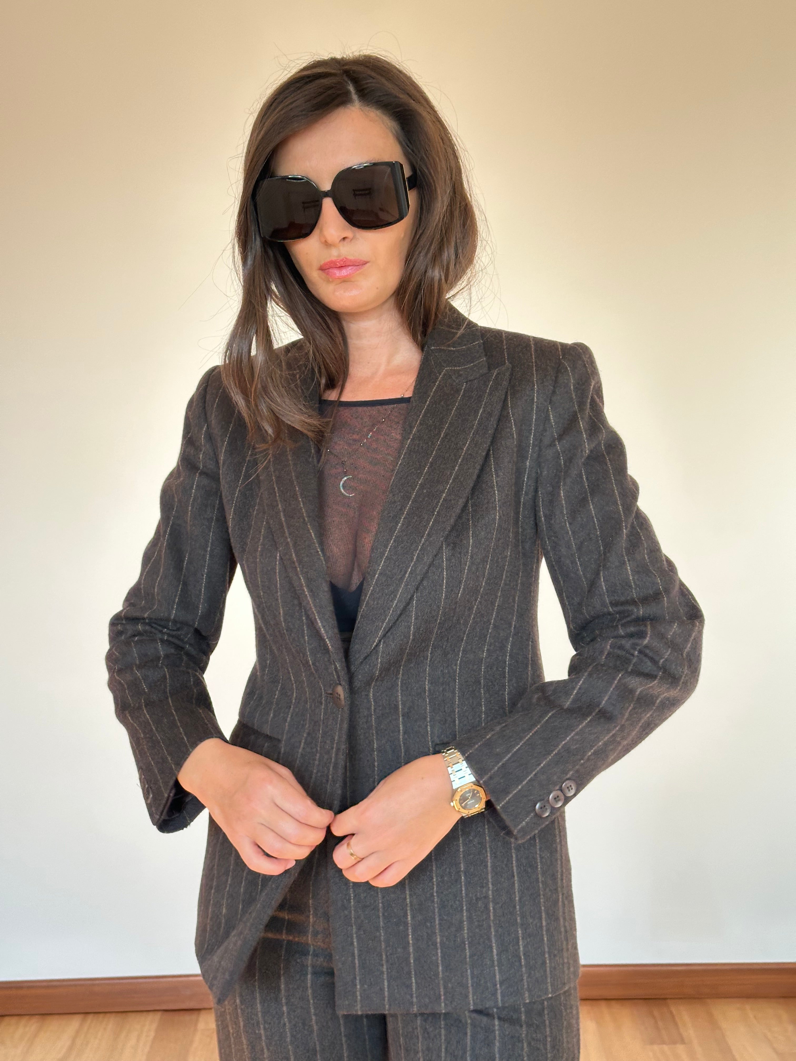 Tailleur Max Mara in 80% lana e 20% angora. Marrone gessato beige. Pantalone e vita alta.