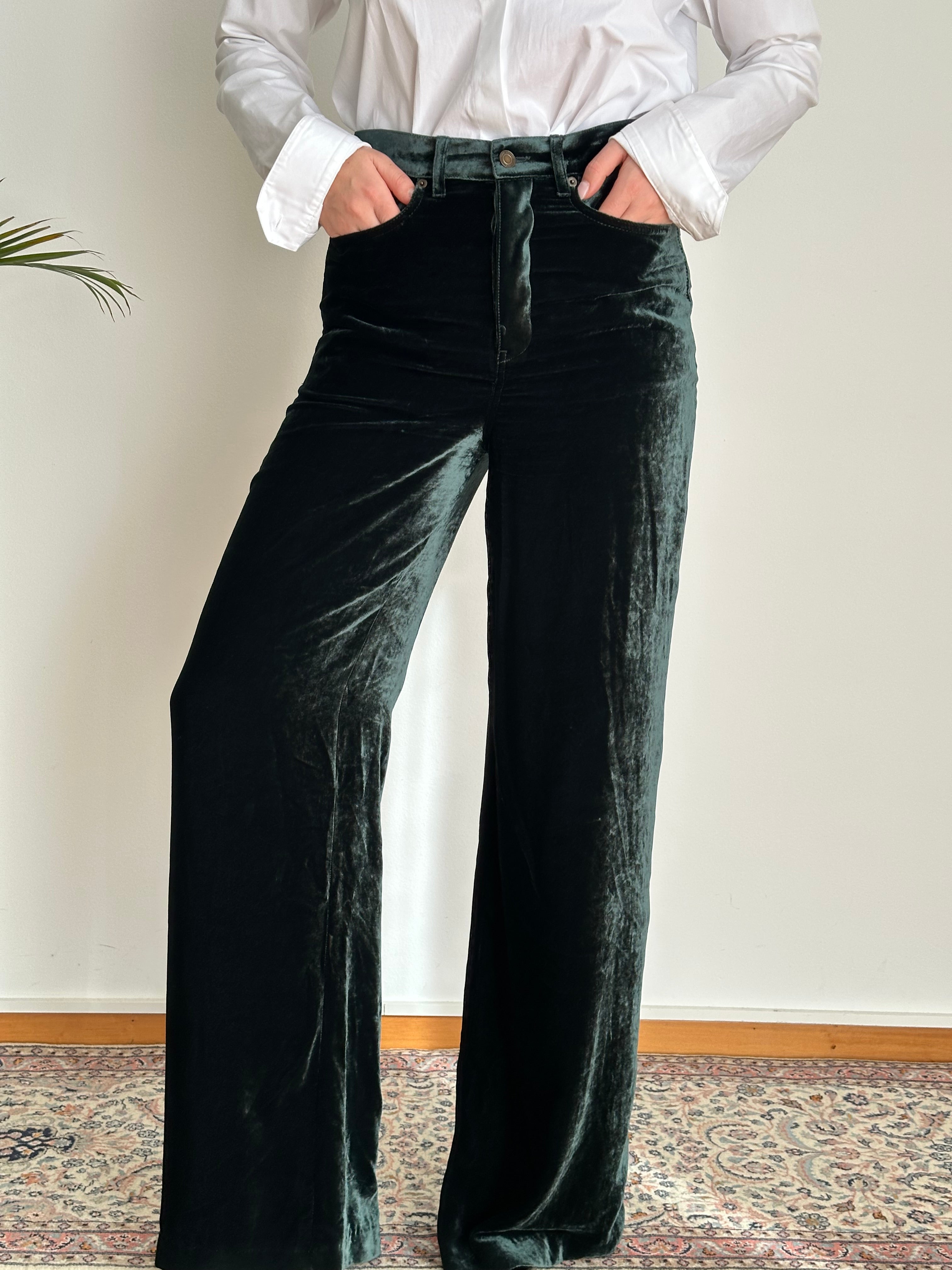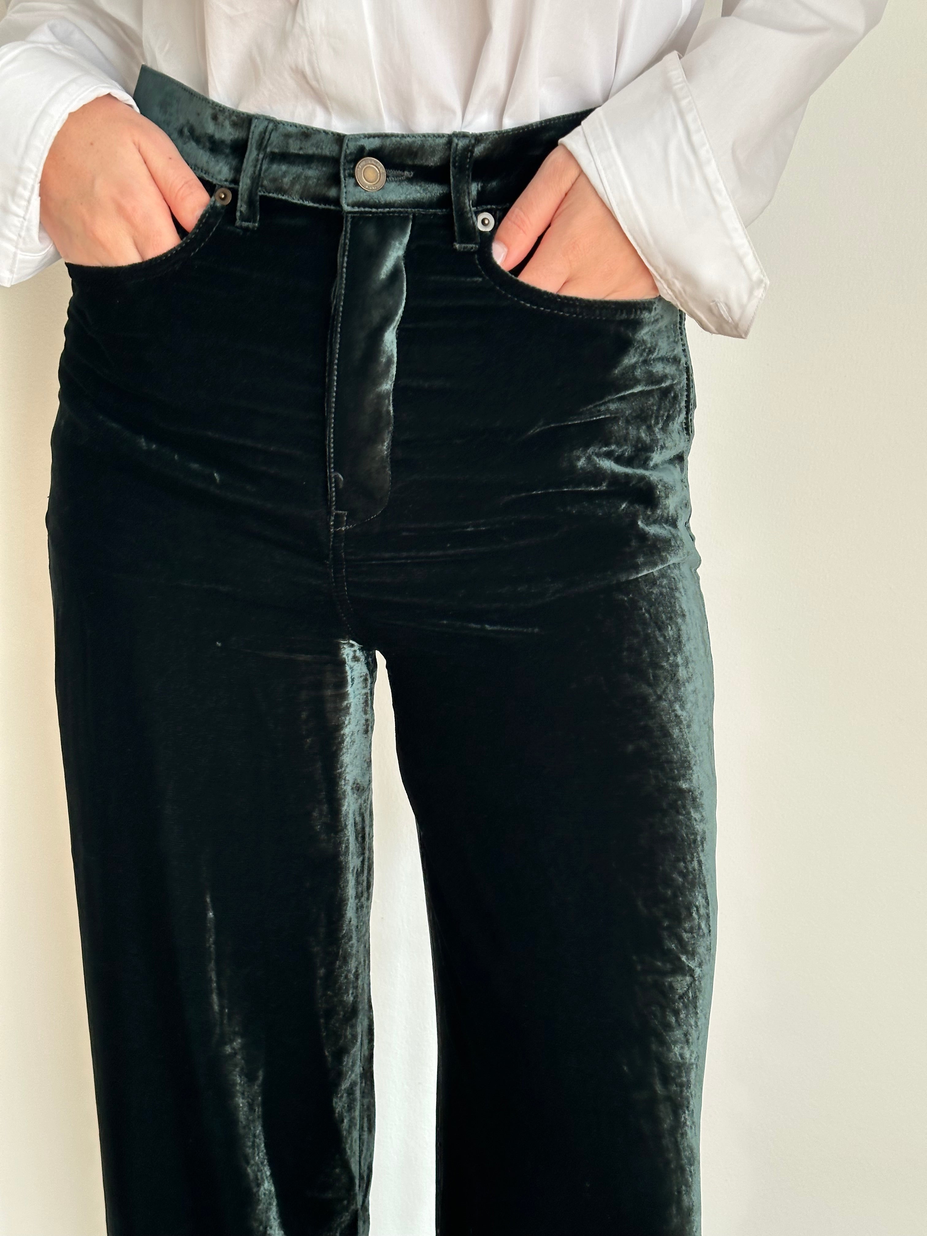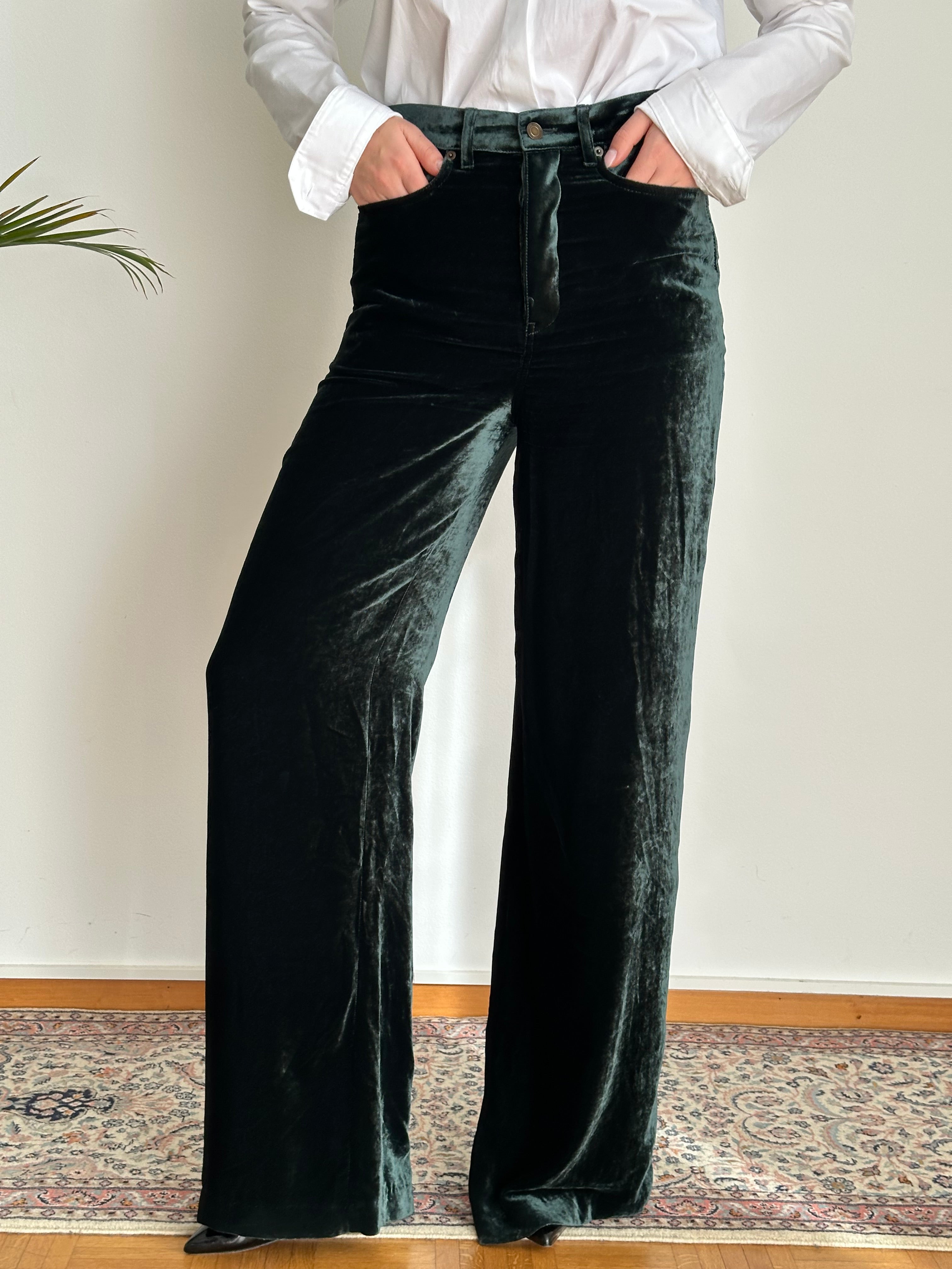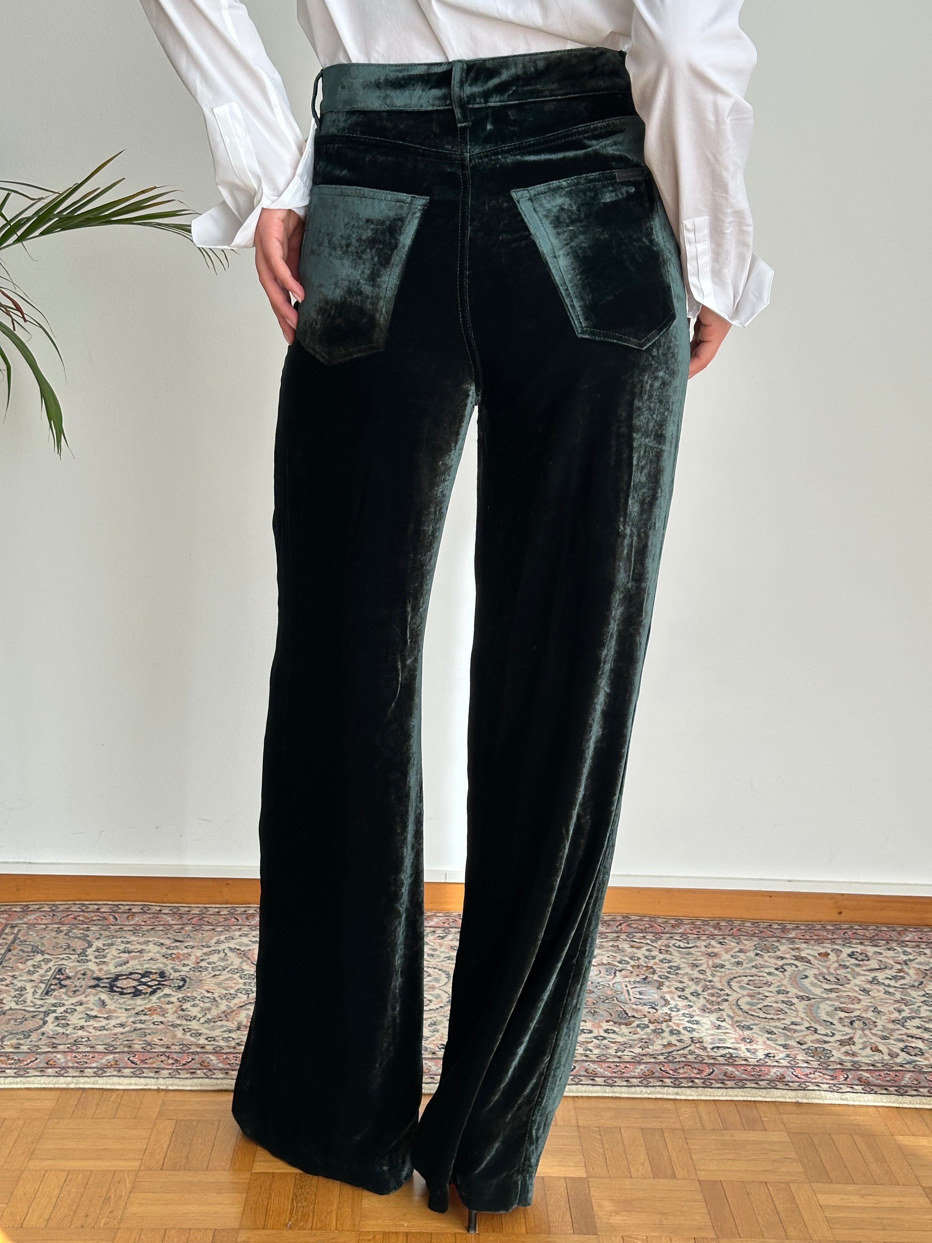 Pantaloni in velluto verde Saint Laurent a vita alta e gamba dritta.