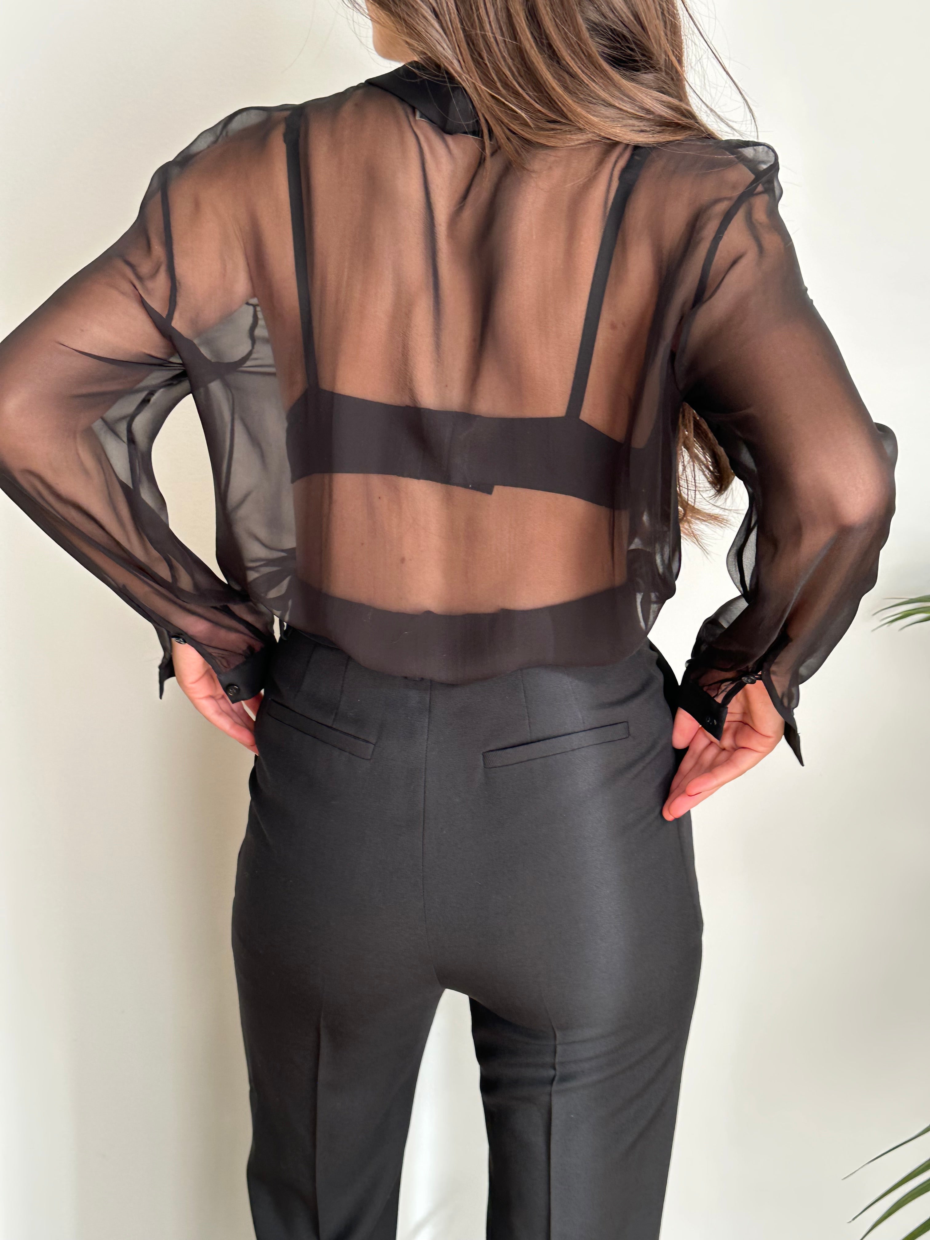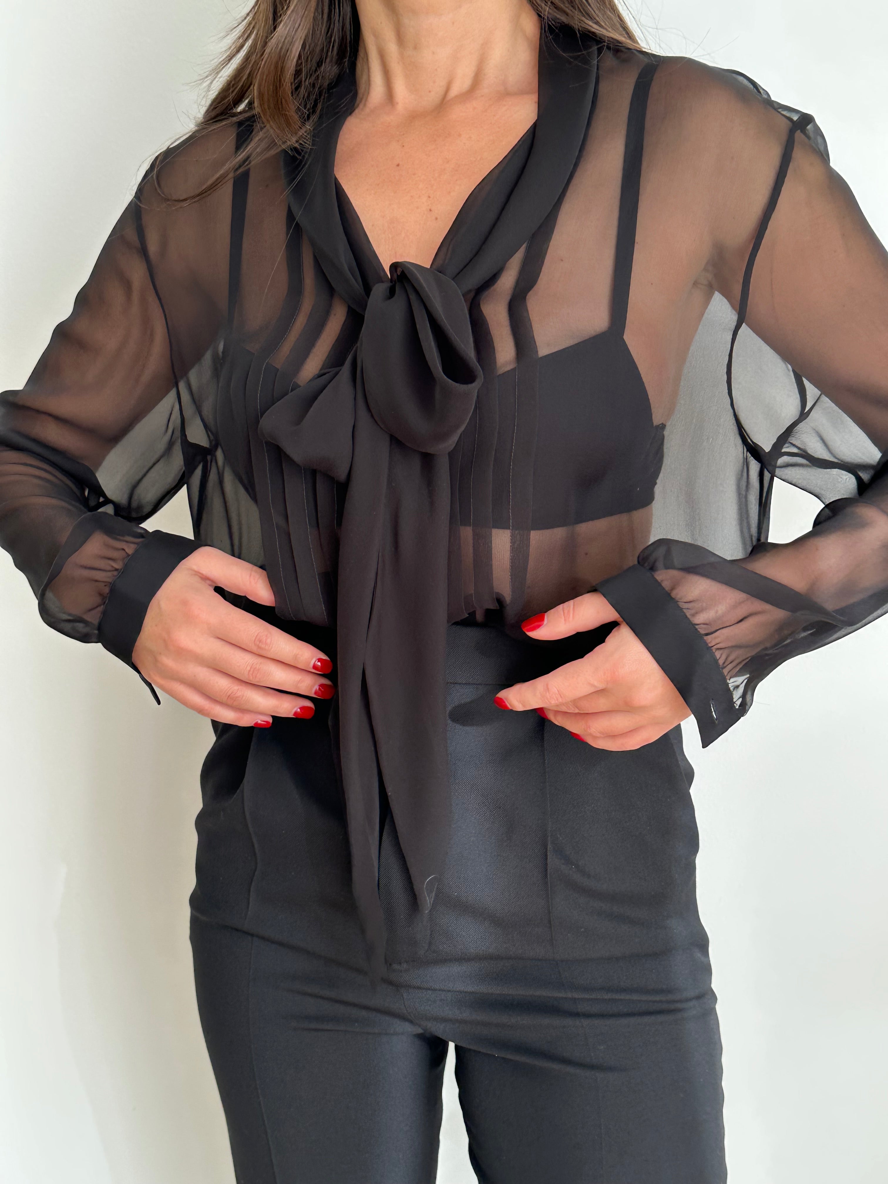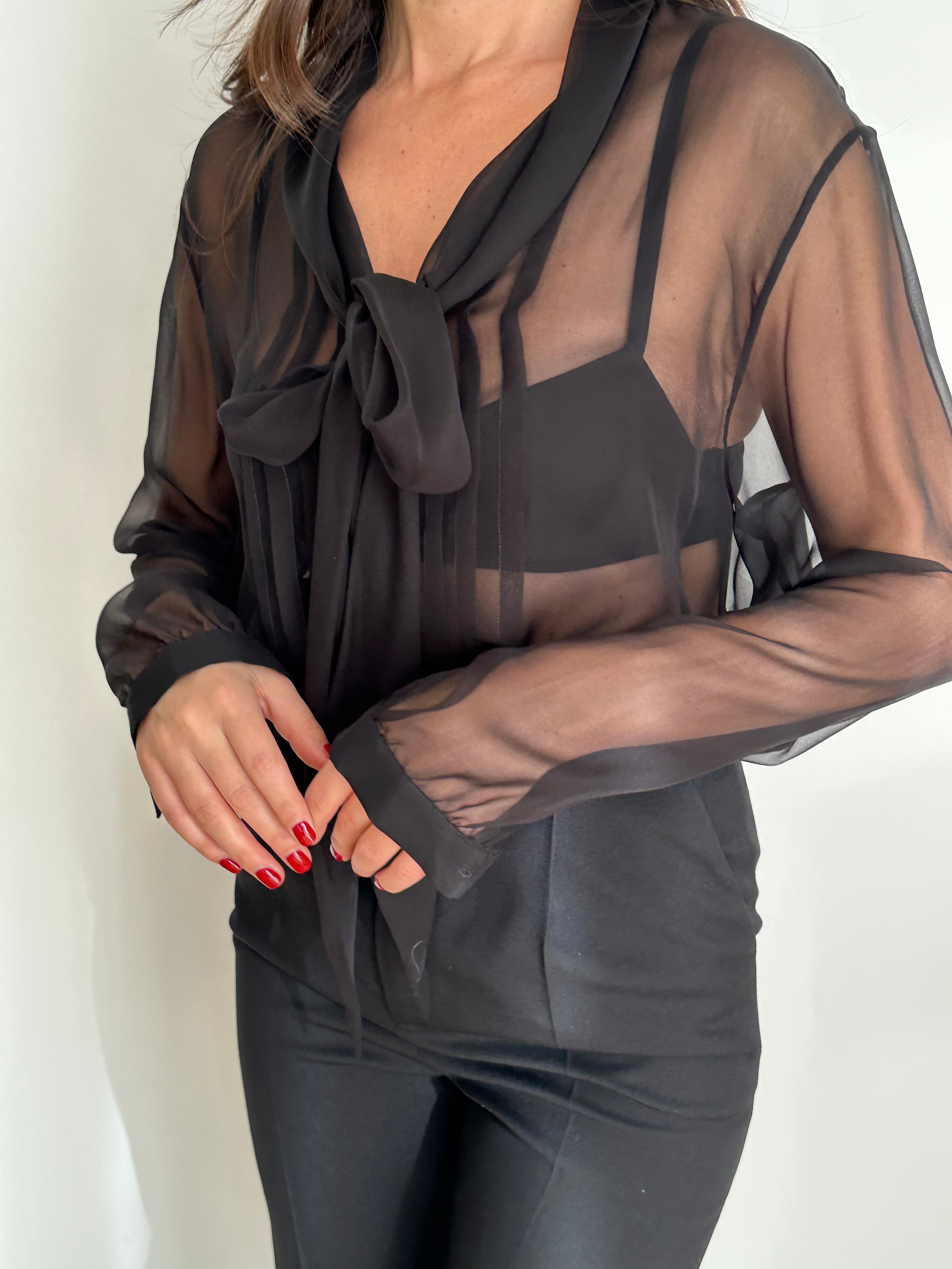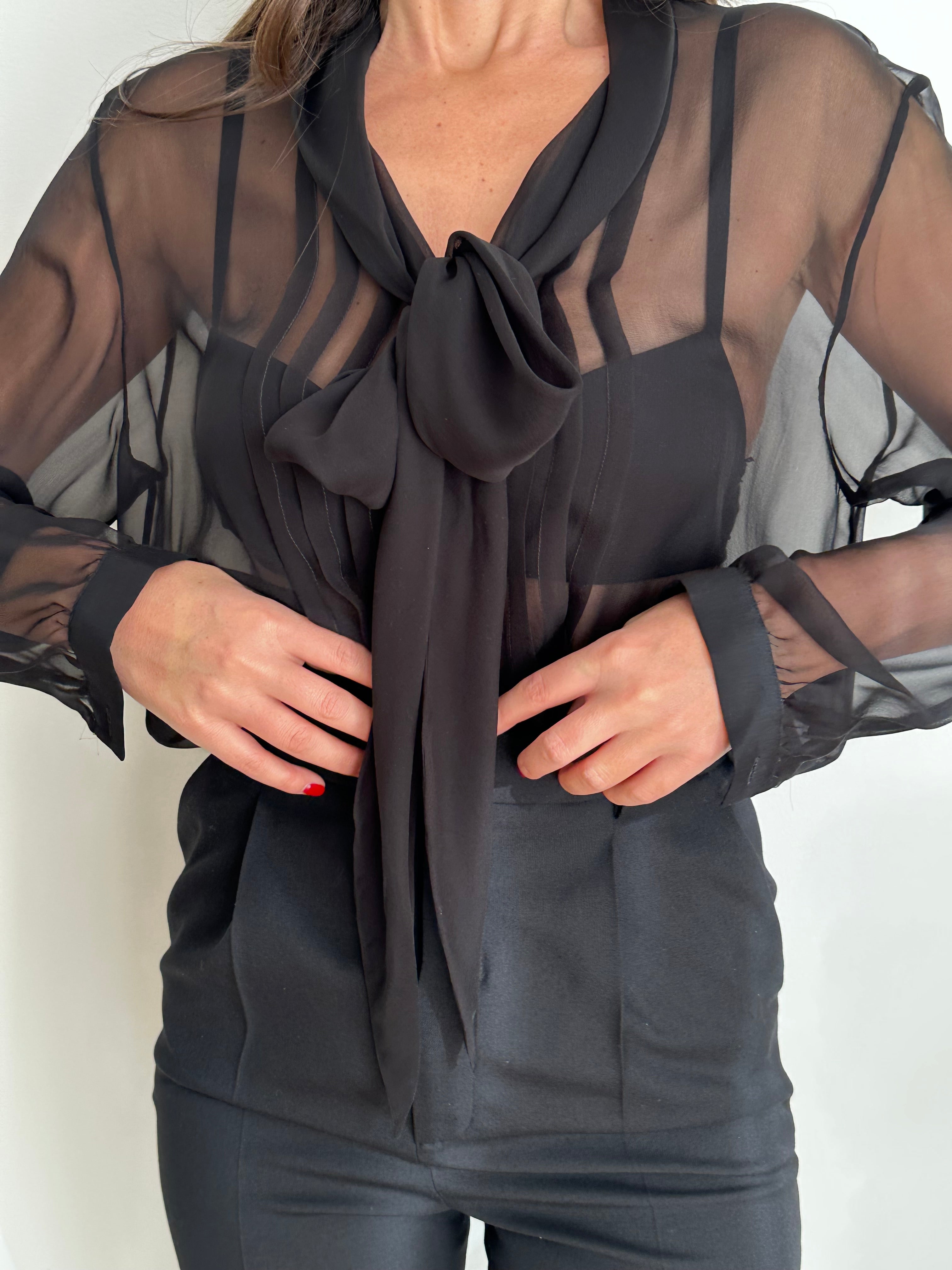 Camicia Saint Laurent nera trasparente con lacci al colletto. Veste dalla taglia S, alla taglia L.