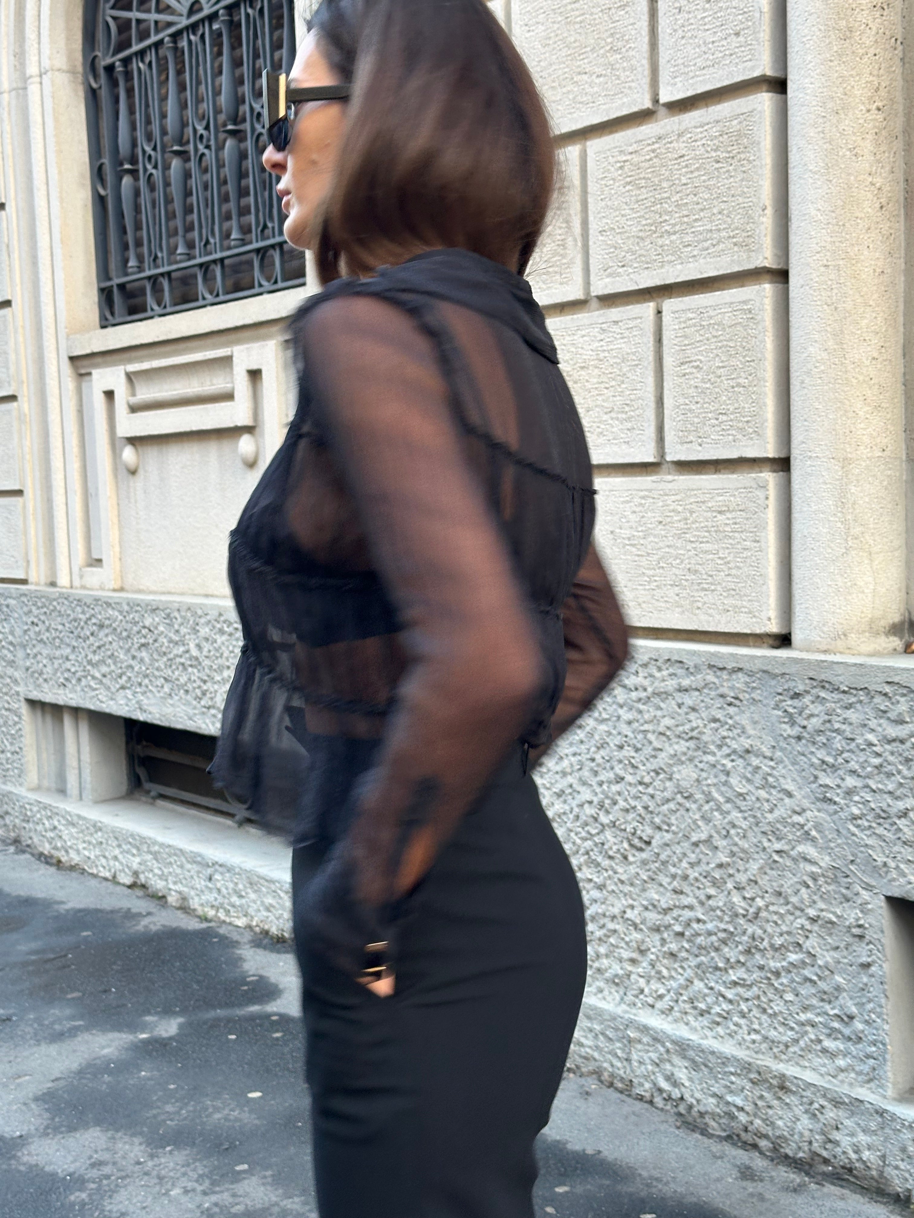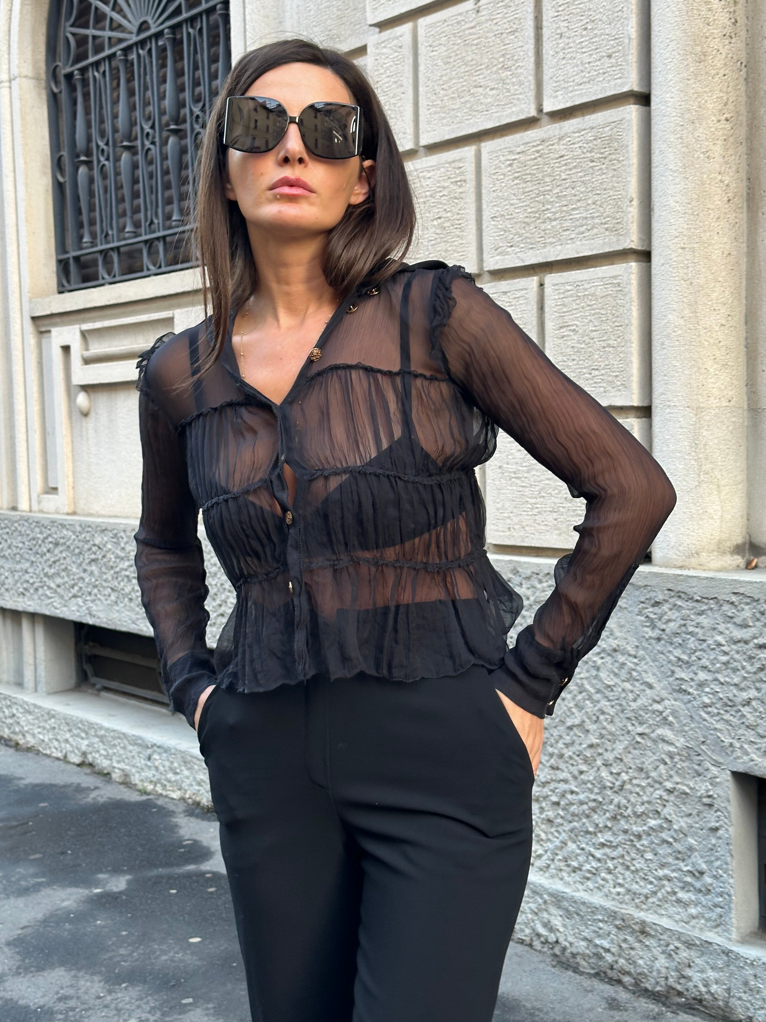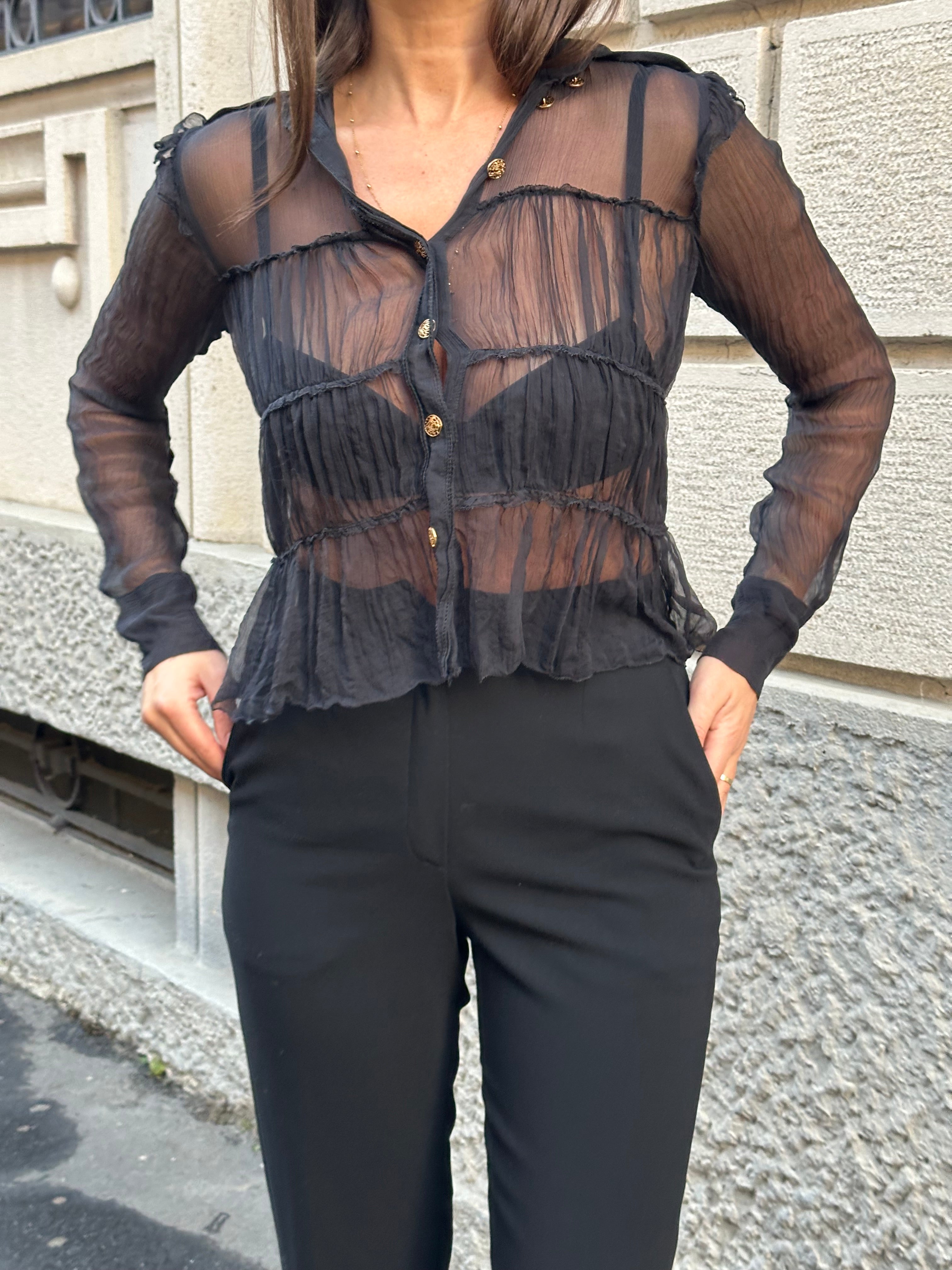 Camicia nera Fendi in 100% seta con bottoni dorati FF logo. Semi trasparente.