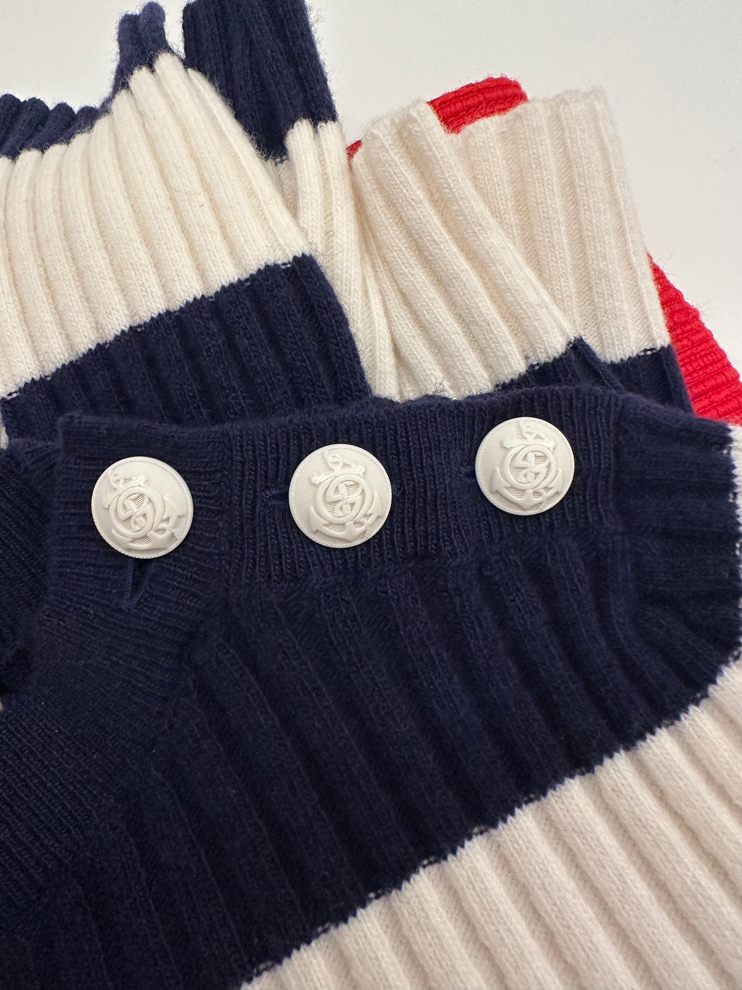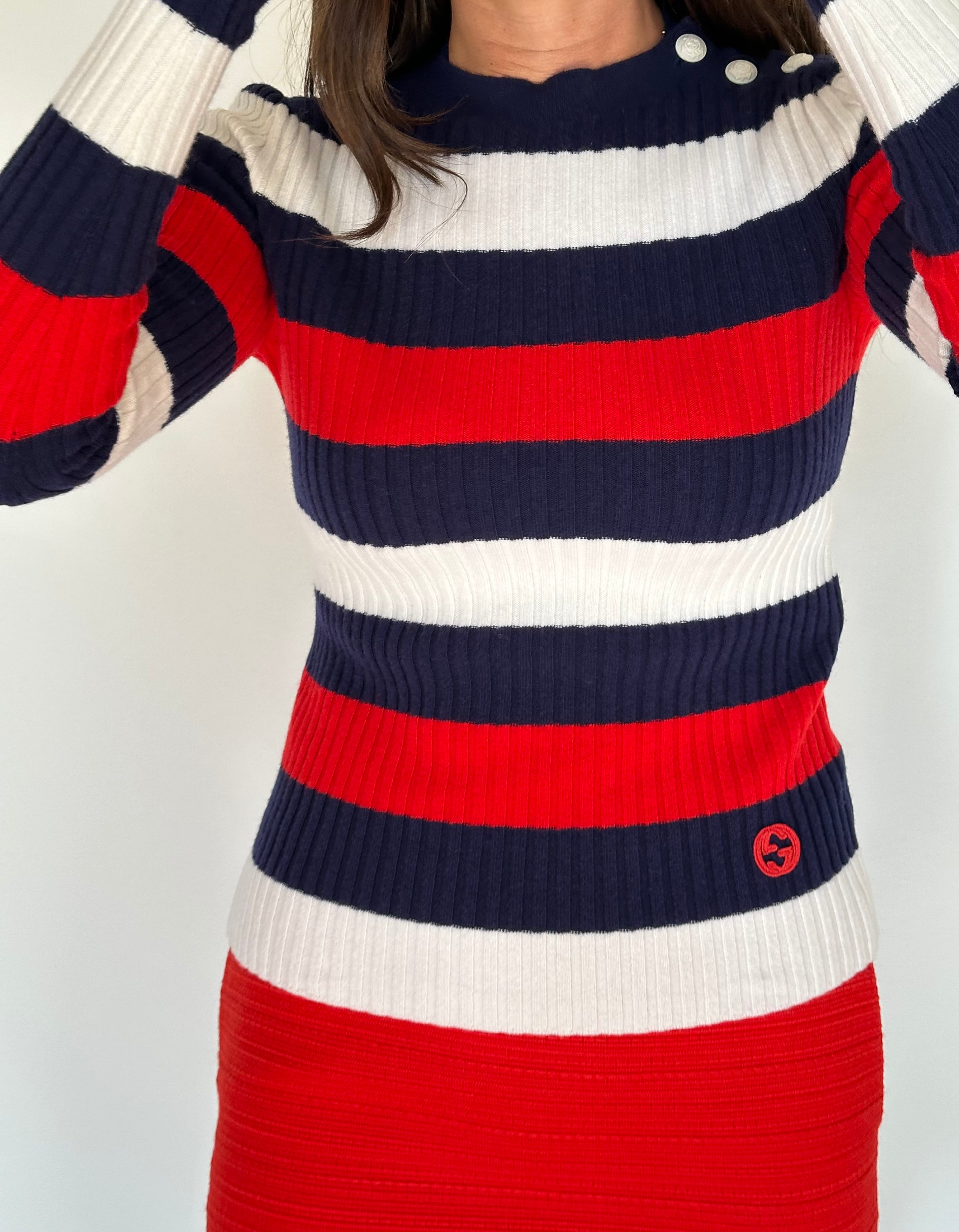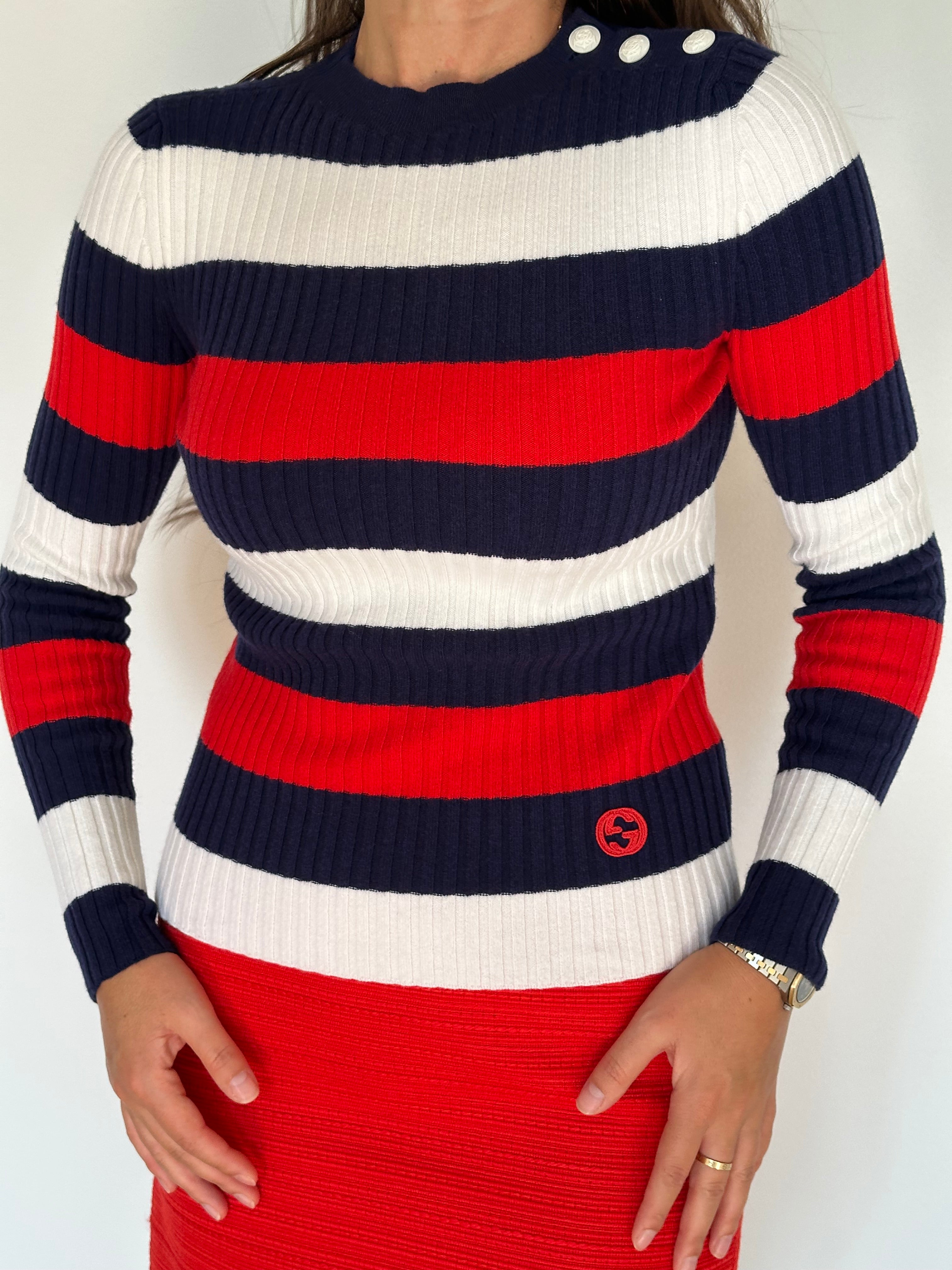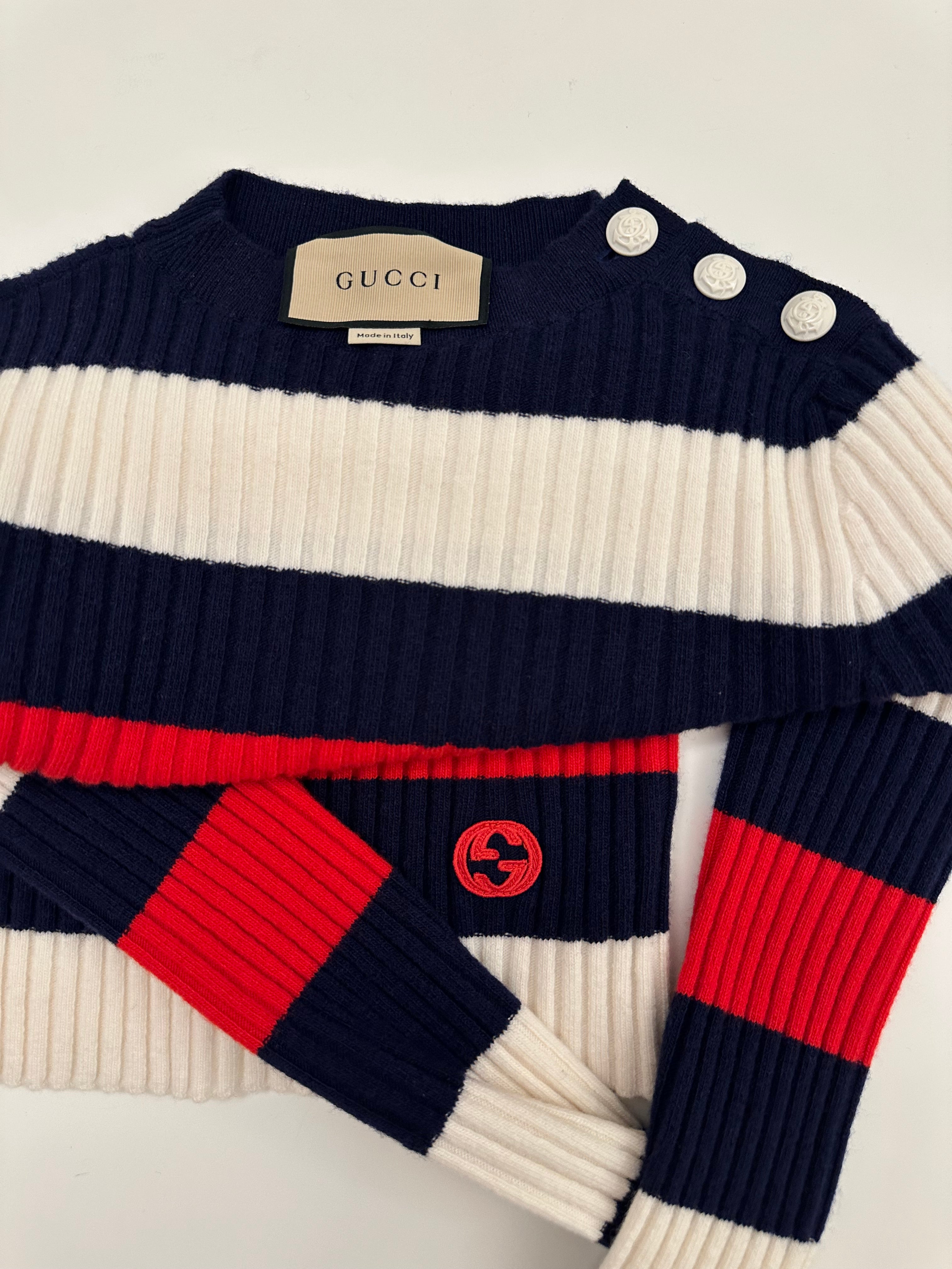 Magione Gucci in lana a righe multicolor. GG logo laterale in basso. Bottoni bianchi marchiati sulla spallina.
