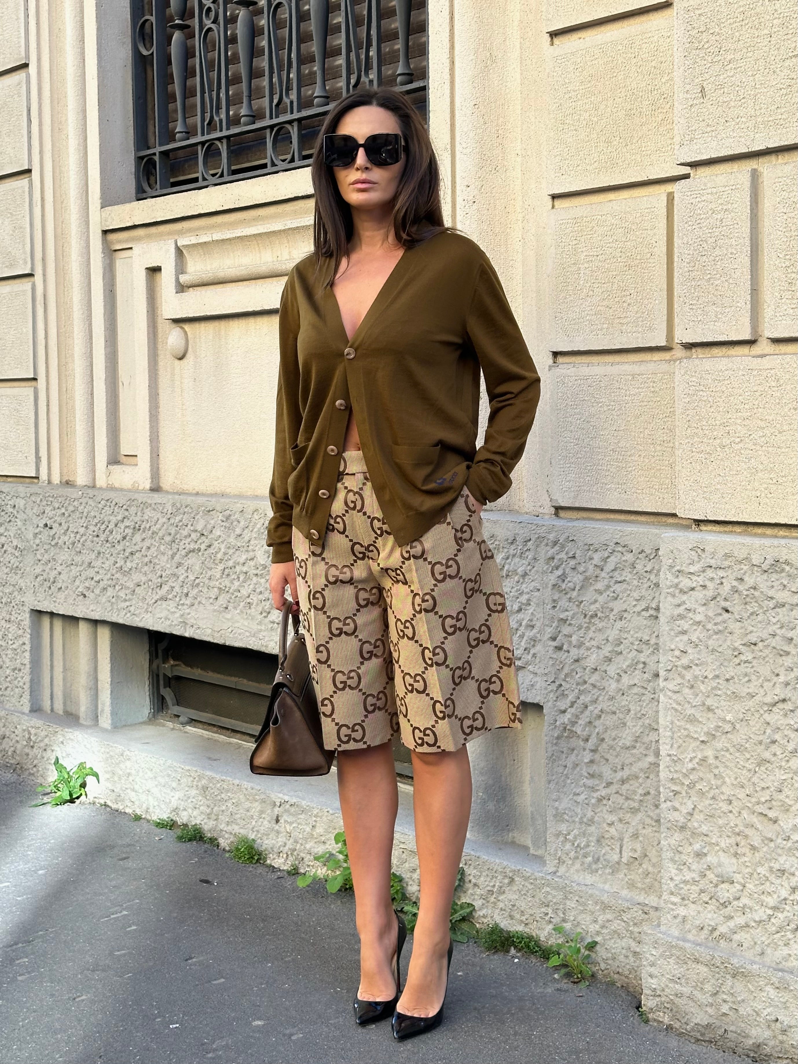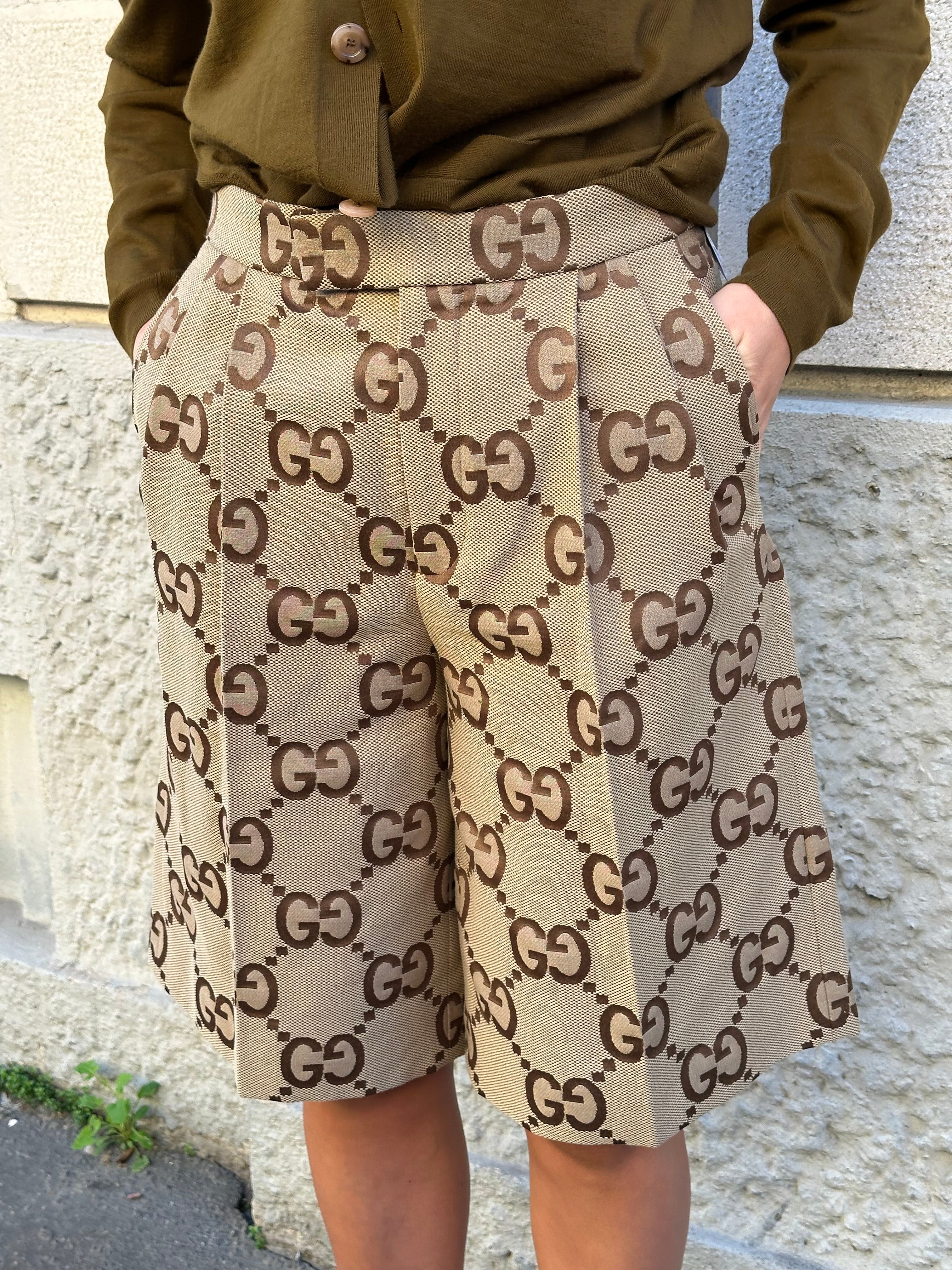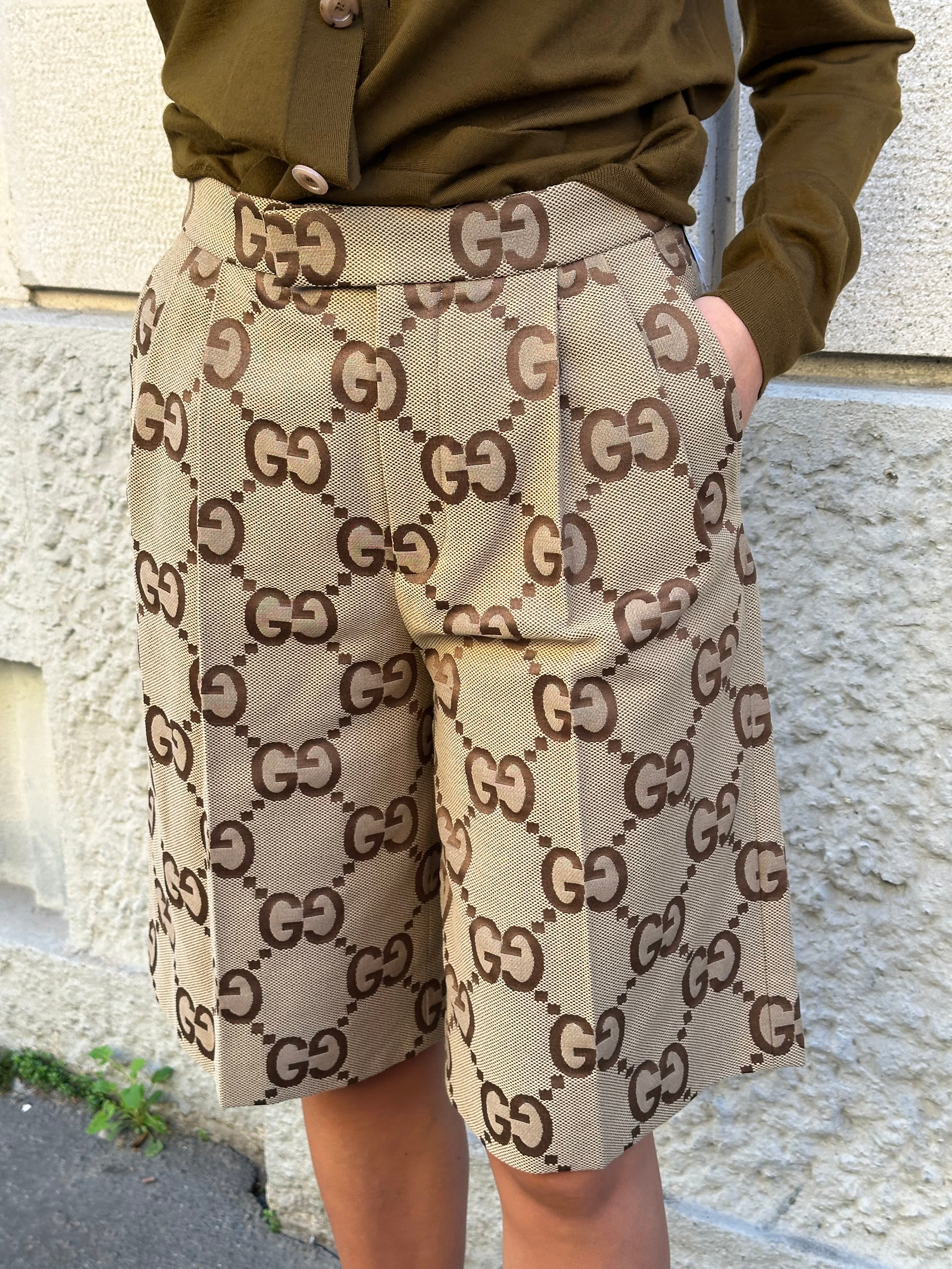 Pantaloni corti Gucci GG logo a vita alta, lunghezza ginocchio.