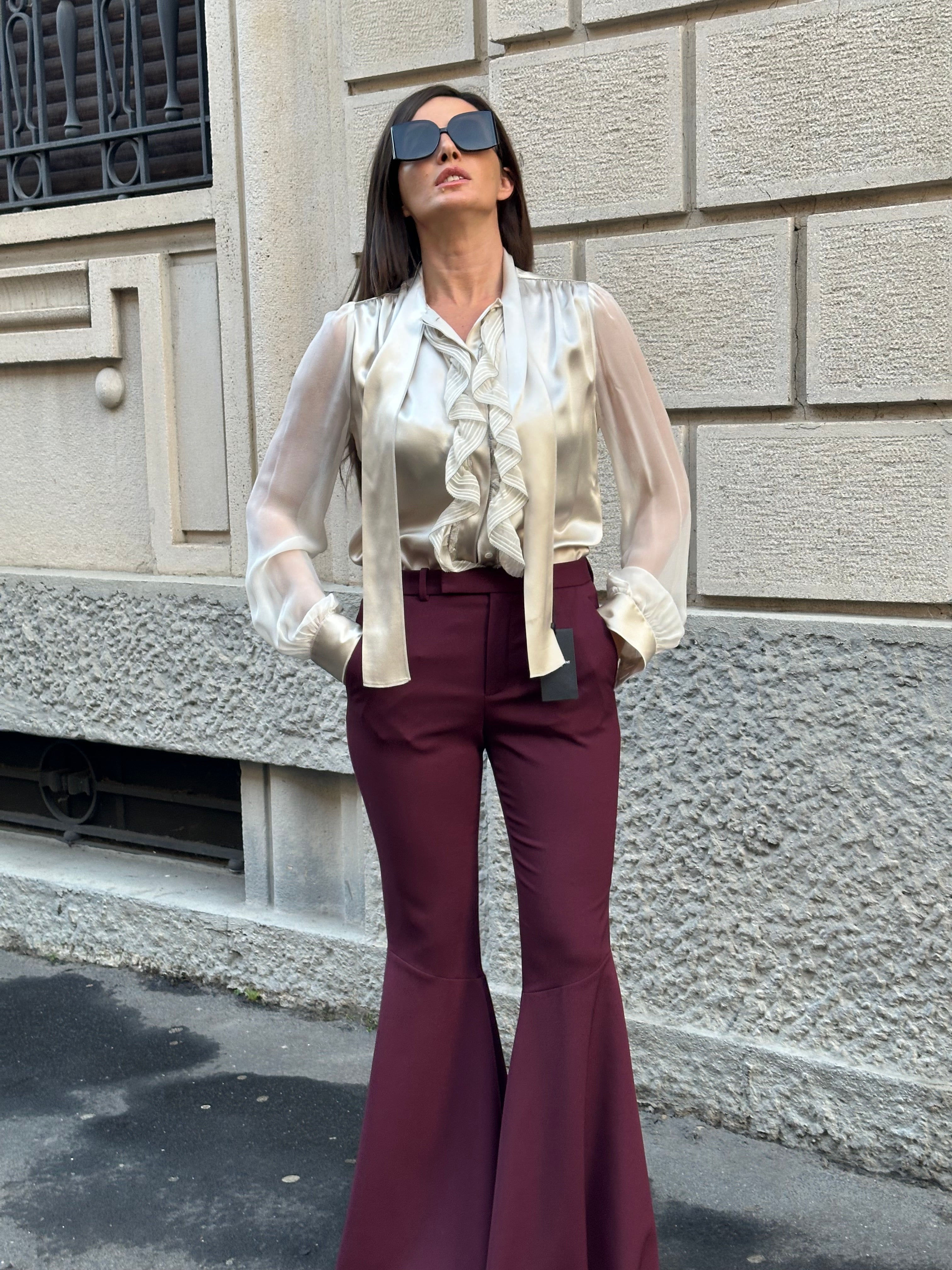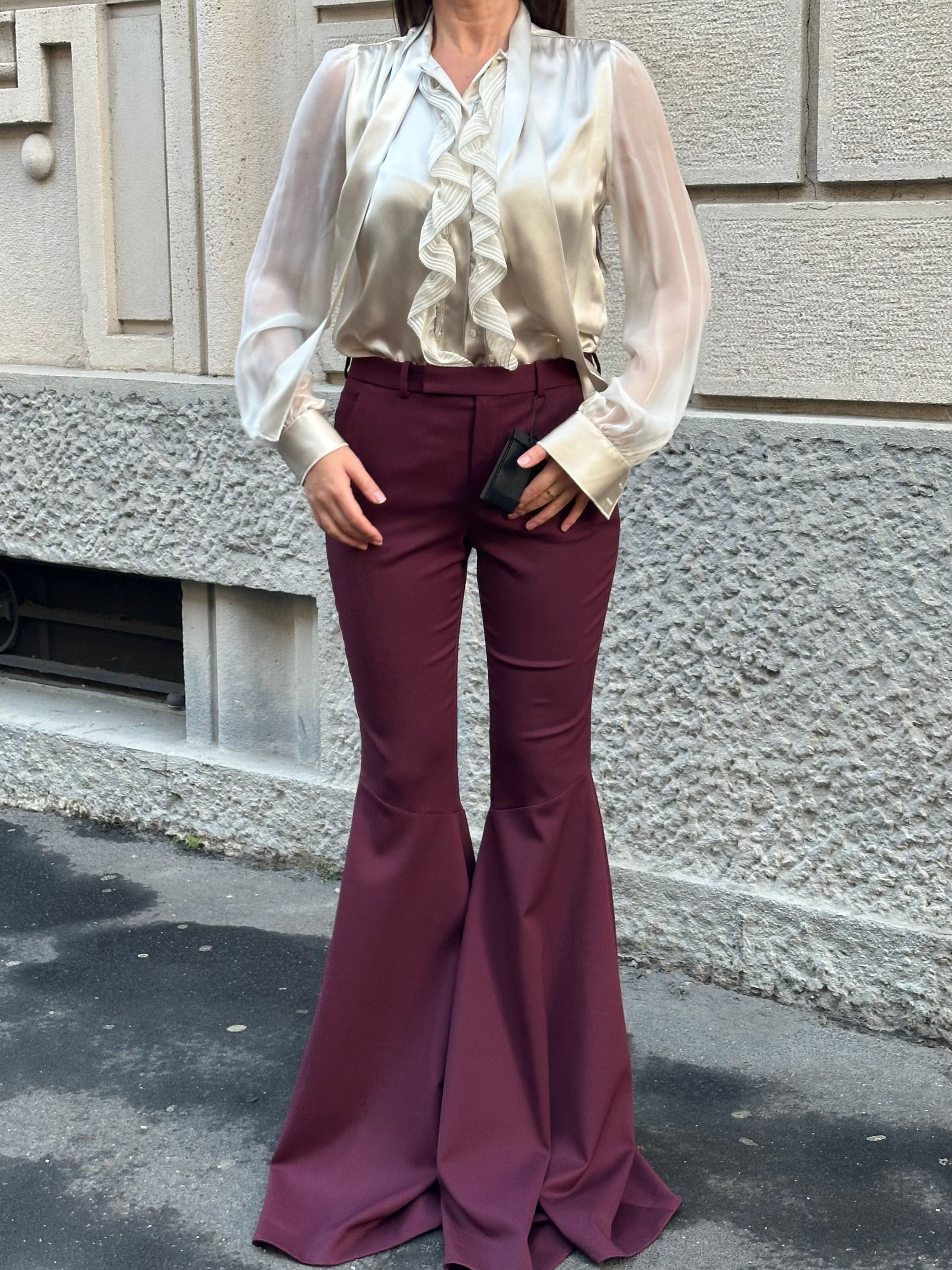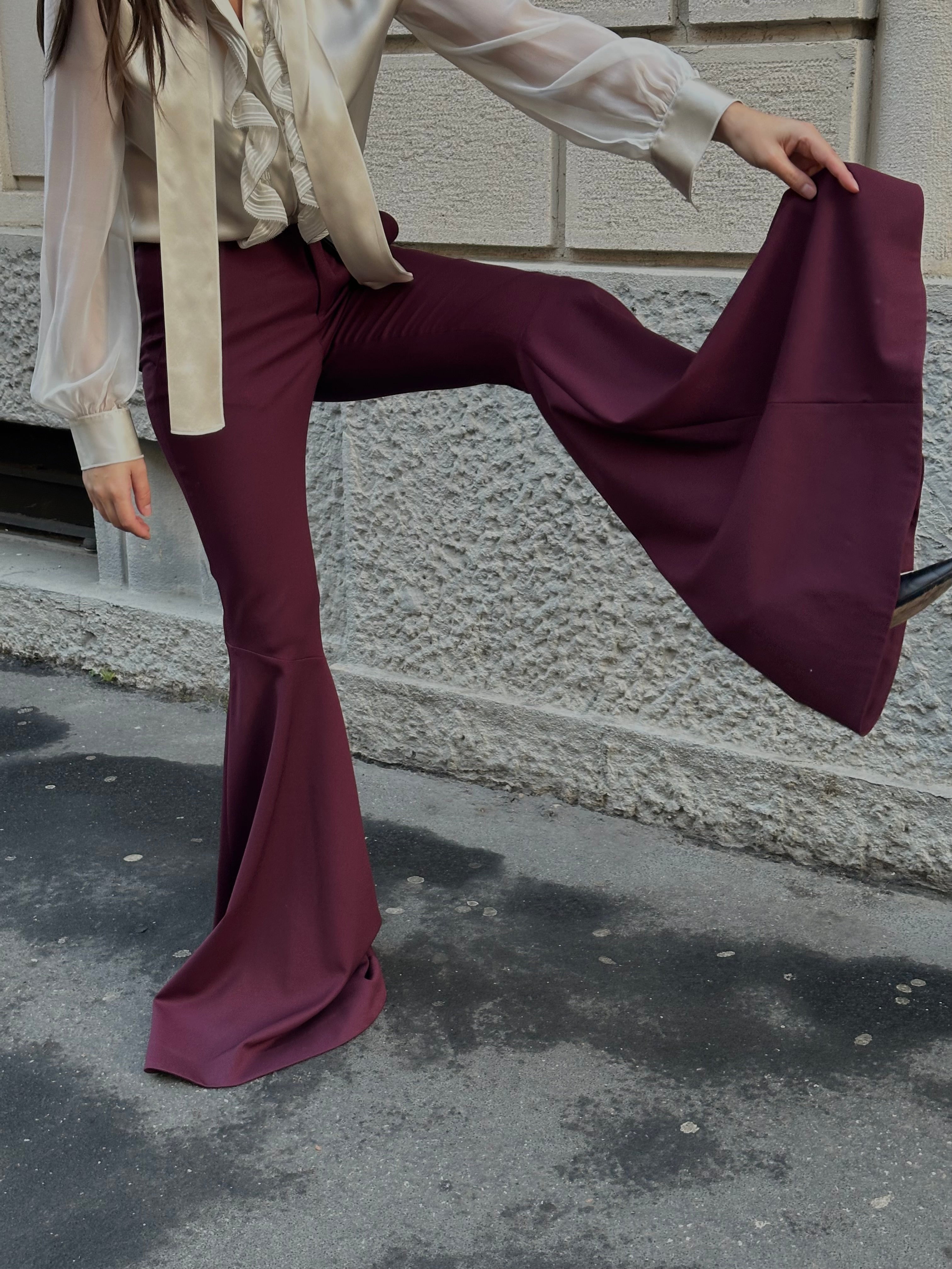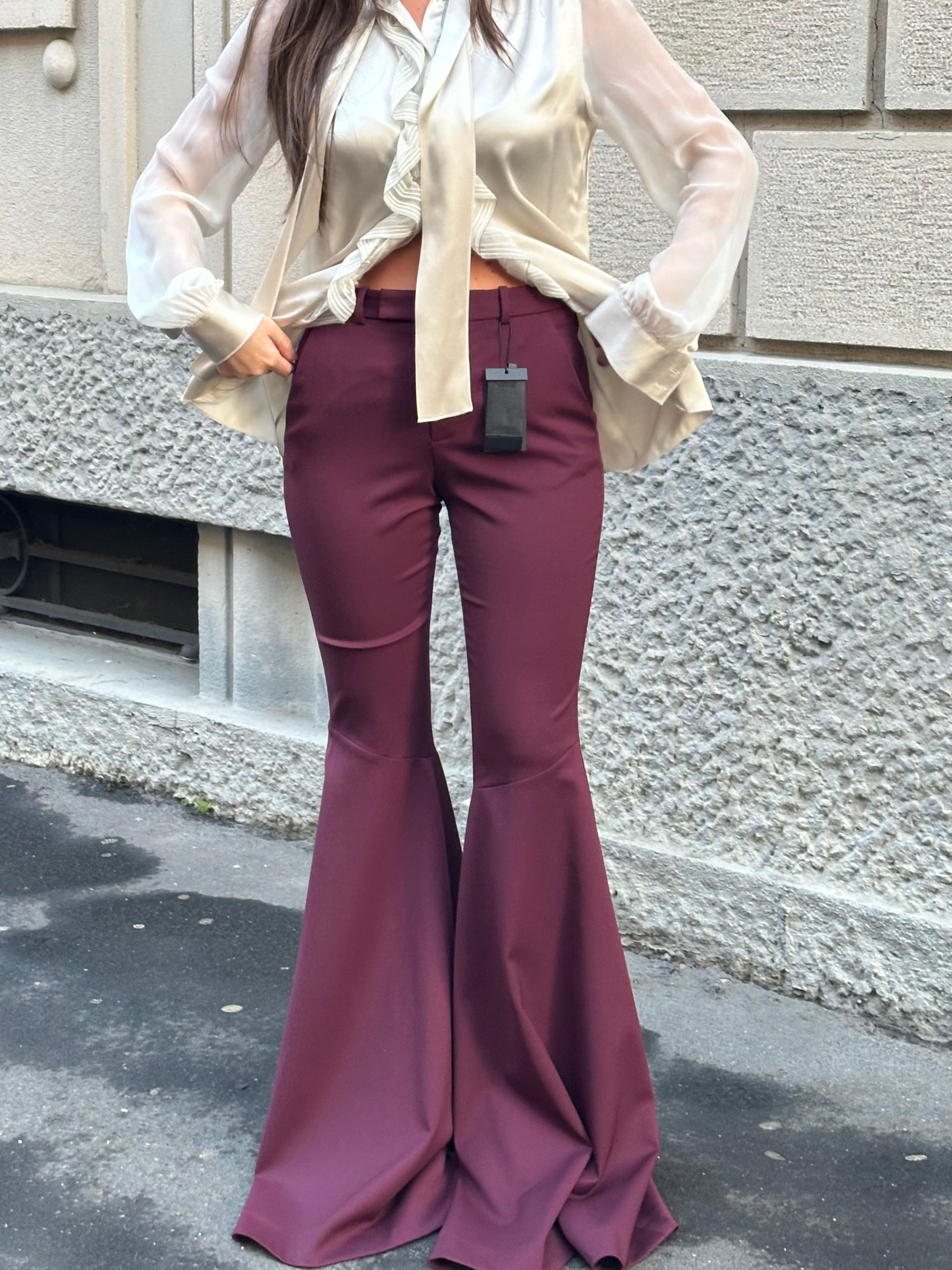 Pantaloni Saint Laurent bordeaux a vita alta e super larghi dal ginocchio in giù.